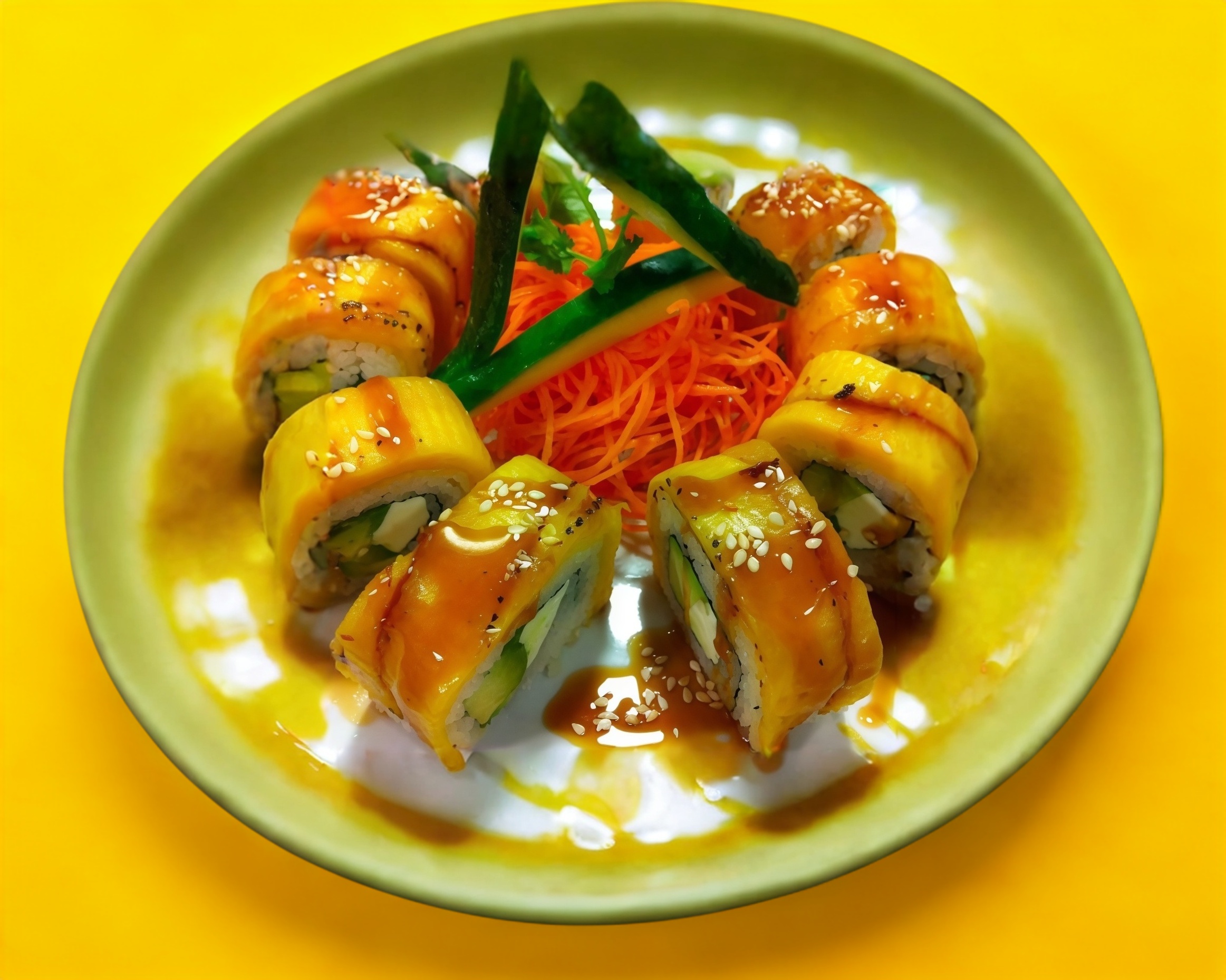 Rollo de sushi personal, de 10 piezas: camarones tempura, queso crema y tampico : capeado crujiente, con una salsa de mango, salmón, salsa chipotle, salsa de anguila y cebollín