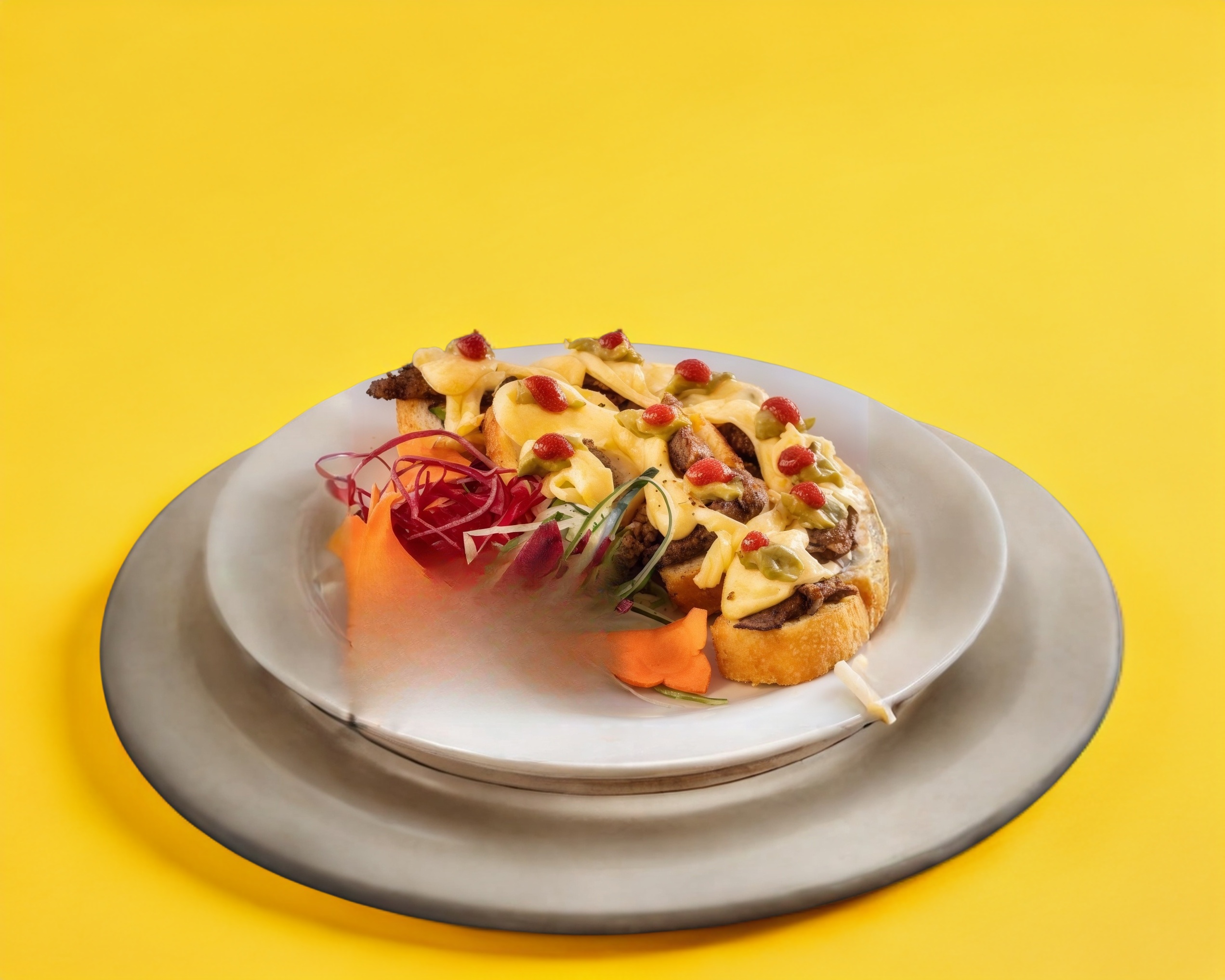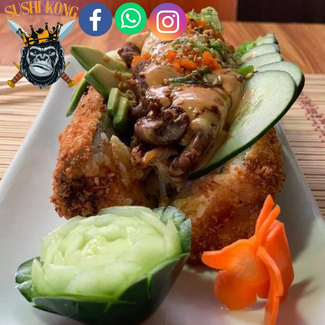 Rollo de 10 pz PD: carne teriyaki de res PF: empanizado con una guarnición de tocino y queso manchego fundido