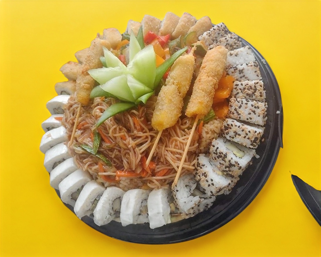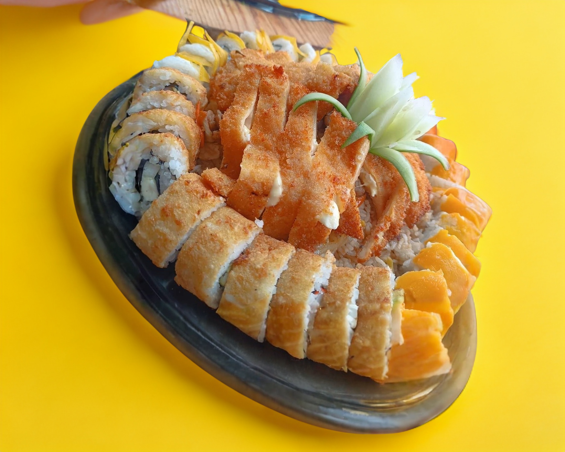 3 rollos (Banana Roll, California Roll y manchego Roll), porción grande de yakimeshi, yakisoba, teppanyaki de verduras y 2 kushiagges de platano