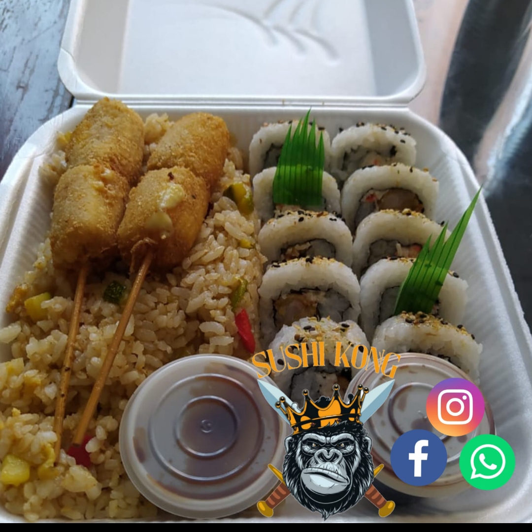 Rollos de 10 pz (California roll tradicional), porción individual de yakimeshi y 2 kushiagges de platano