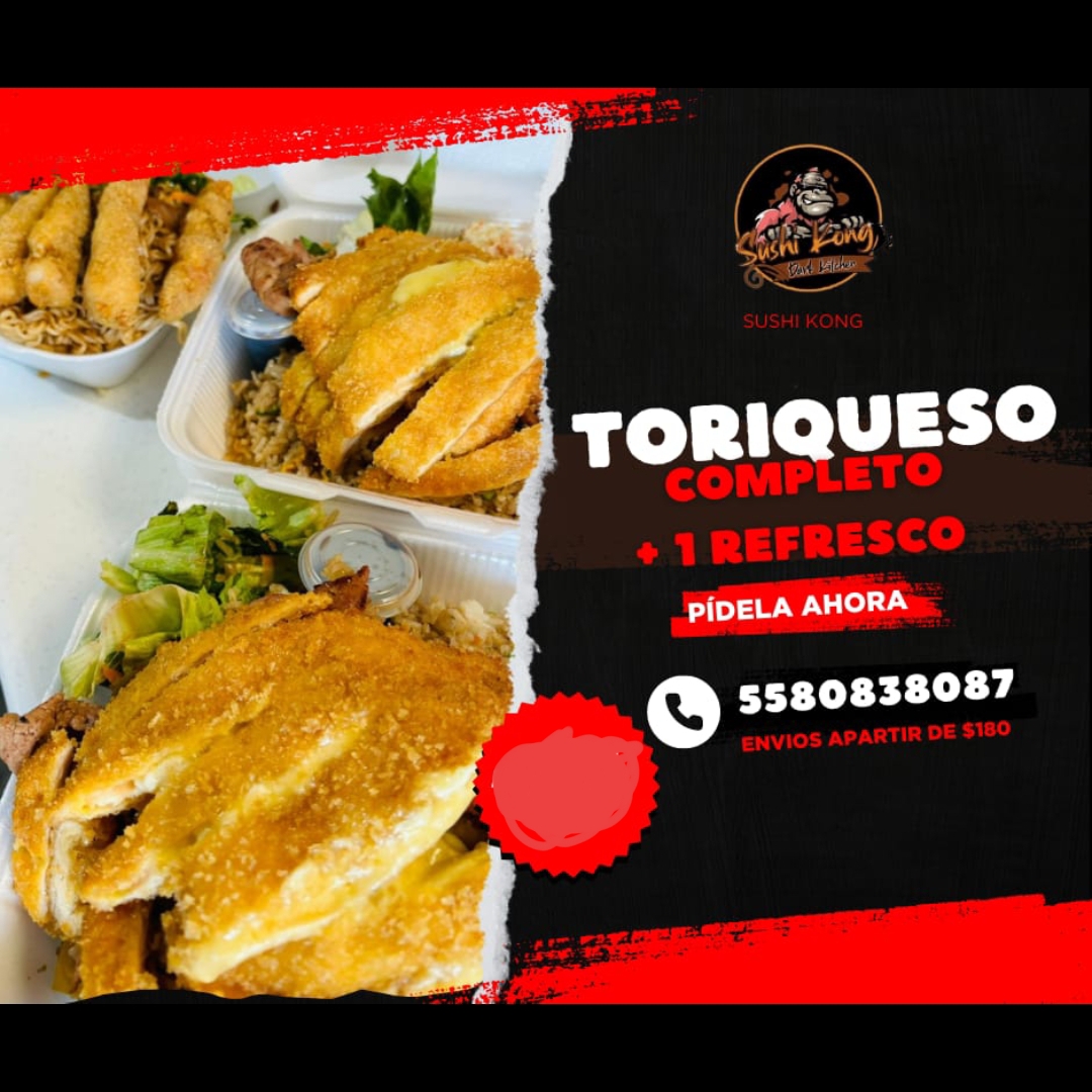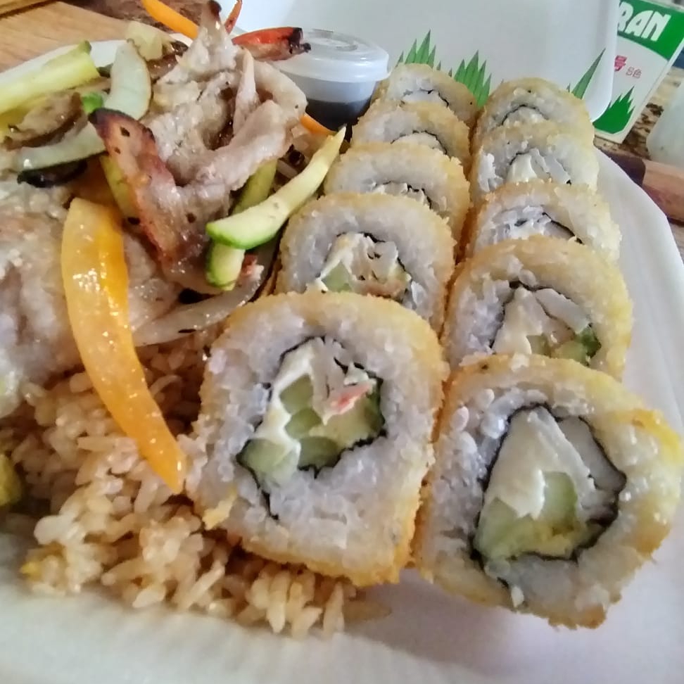 3 rollos (Banana Roll, California Roll y manchego Roll), porción grande de yakimeshi de verduras con carne teriyaki de res y 2 toriquesos