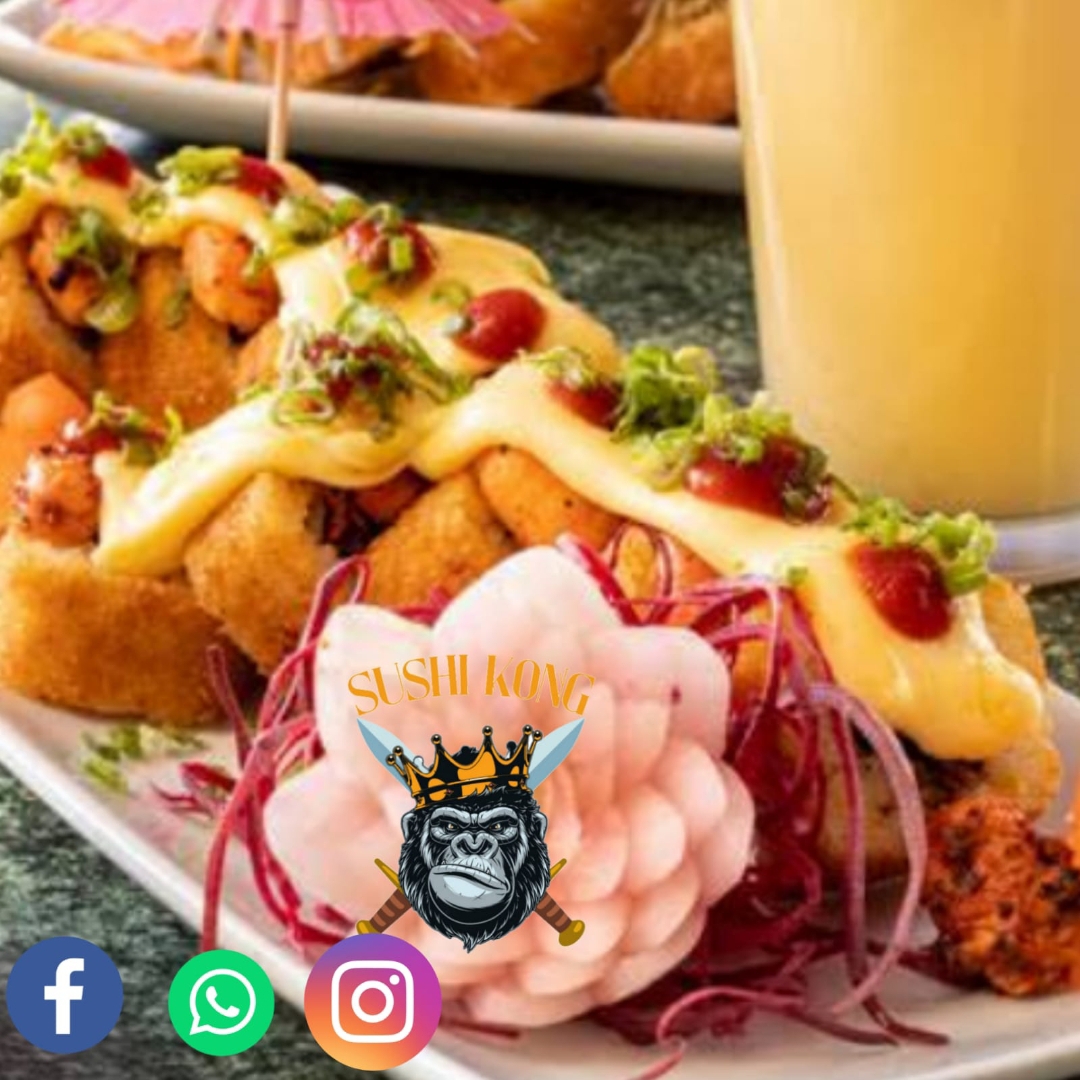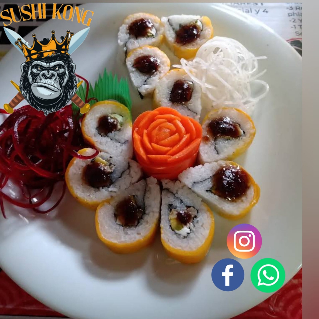 Rollo de 10 pz PD: Tampico, kakeagge, aguacate, queso crema PF: carne teriyaki de res con queso manchego fundido