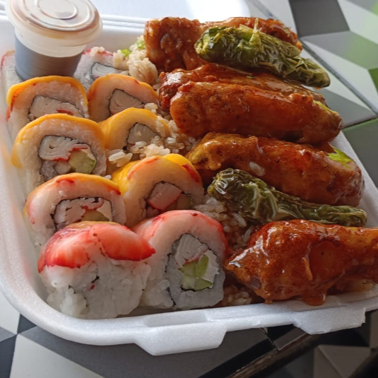 Platillo individual que incluye rollos de sushi (10 piezas) a elegir, porción individual de yakimeshi, carne teriyaki de res y pollo agridulce estilo japonés; acompañado de salsa de soya. 🍣🍚🥢