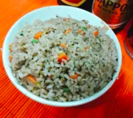 Elaborado con camarón, pollo y res, sazonado con salsa dulce sobre cama de arroz frito.
