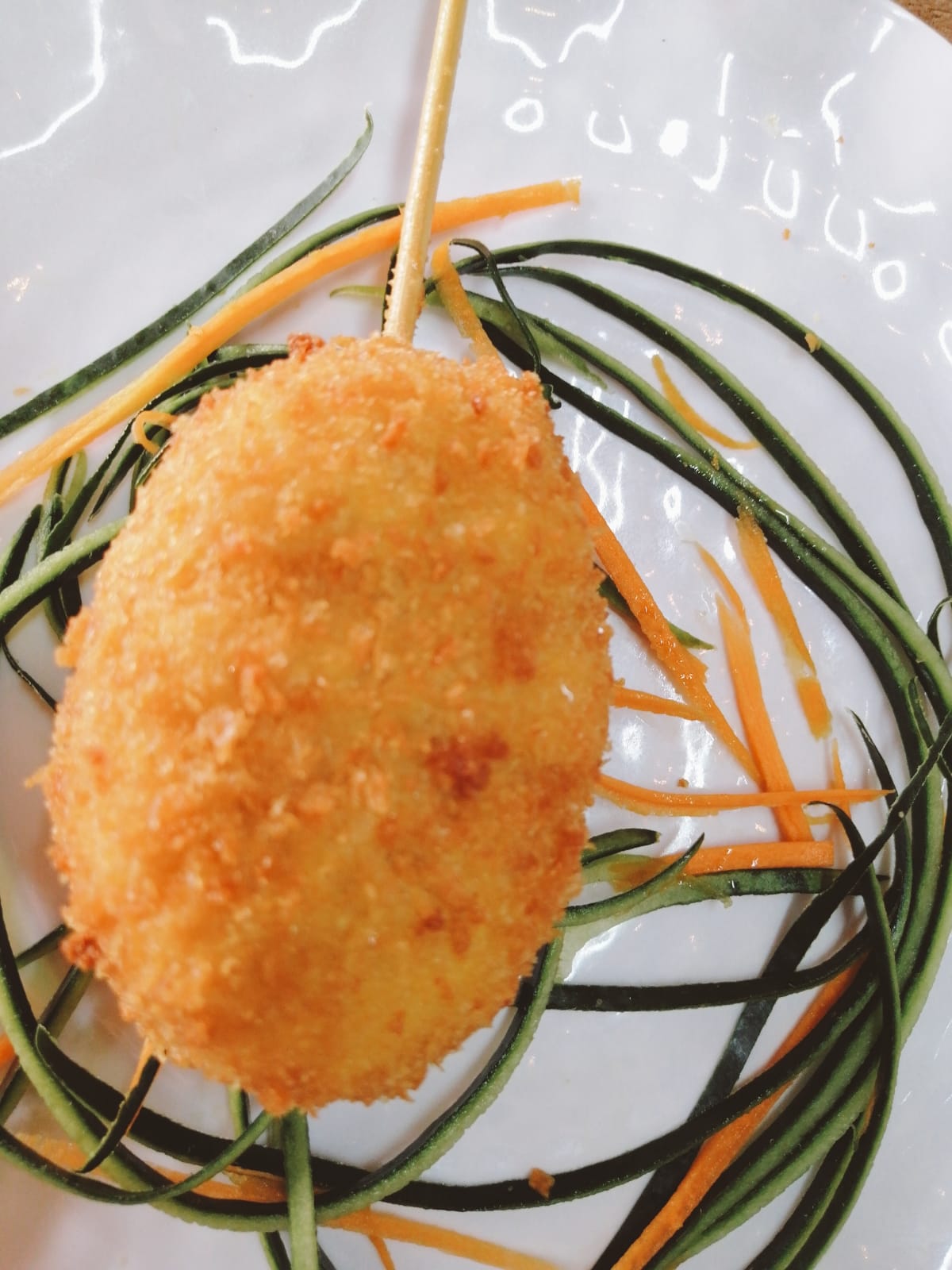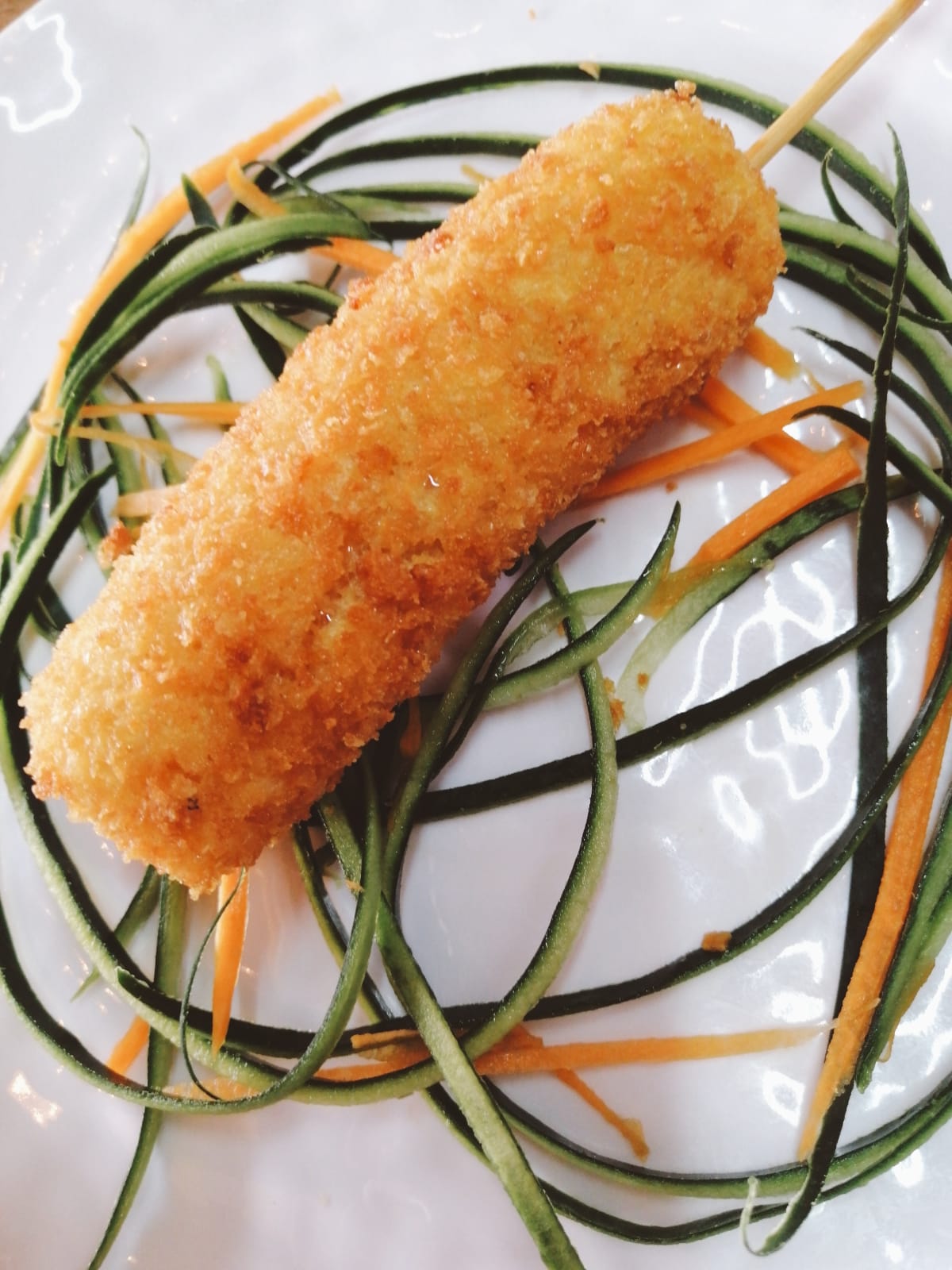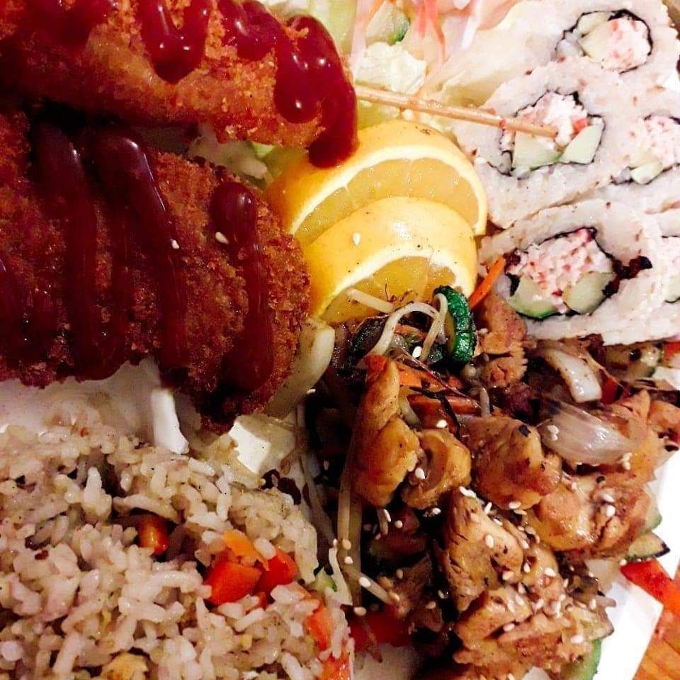 Riquísimo paquete, kushiage queso 1 pieza, kushiage pescado 1 pieza, yakimeshi verduras, teppanyaki pollo media orden, ensalada de surimi y fruta.