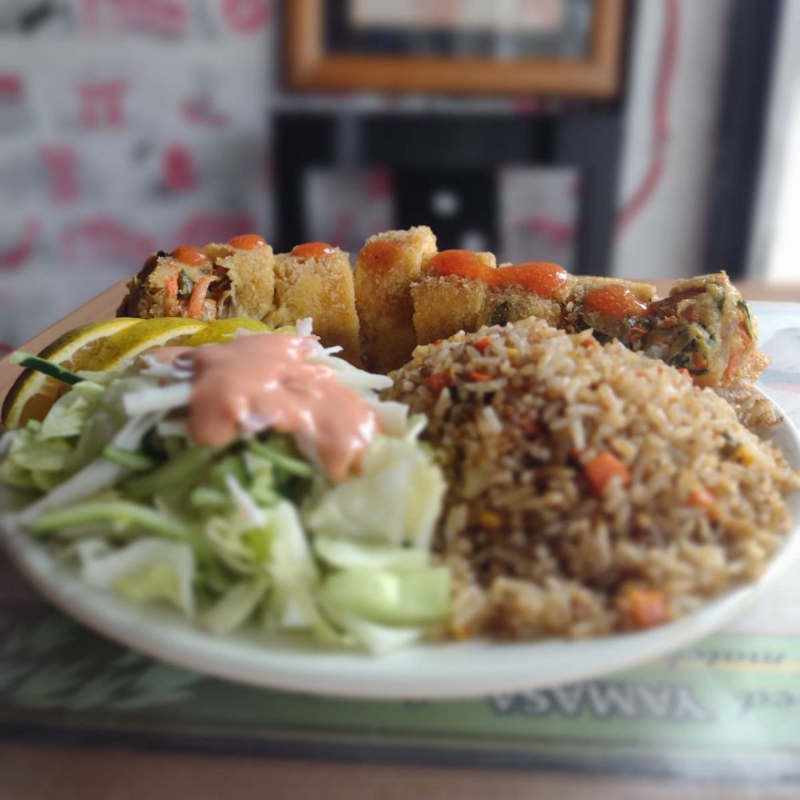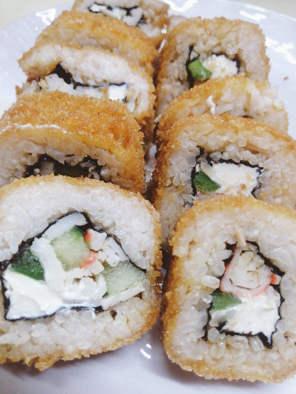 Platillo individual: 10 piezas de sushi empanizado con surimi, queso crema y pepino. Acompañado de yakimeshi de verduras, 1 pieza de kushiage de queso y ensalada de surimi. Todos los ingredientes preparados.
