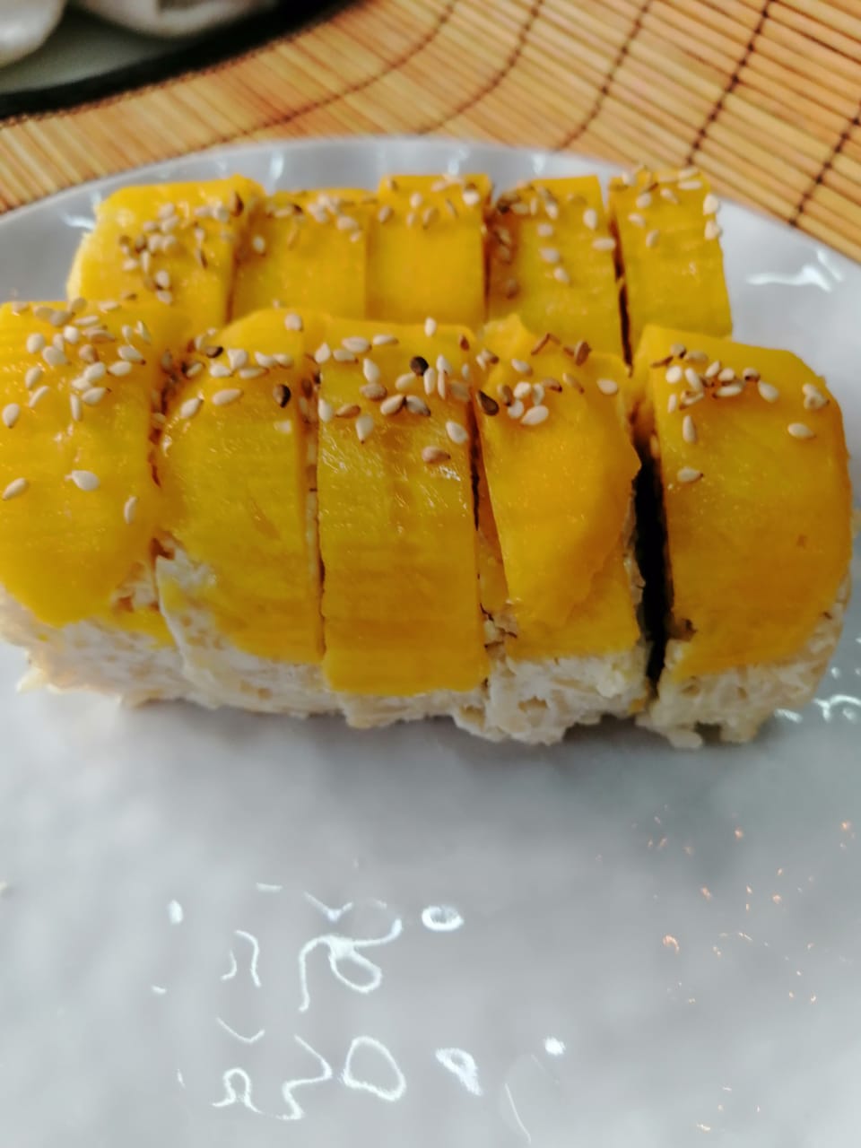 Sushi grande de 10 bocados: por dentro lleva camarón empanizado con queso crema, y por fuera una deliciosa mezcla de pasta de cangrejo y mango, bañada con exquisita salsa de tamarindo.