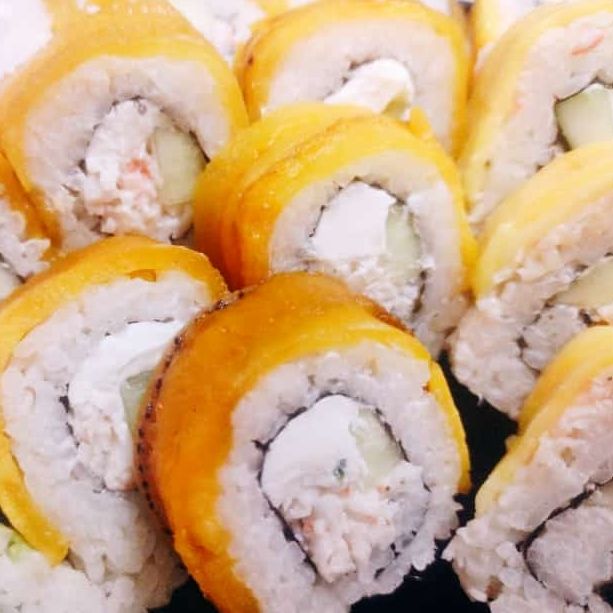 Sushi grande de 10 bocados: por dentro lleva camarón empanizado con queso crema, y por fuera una deliciosa mezcla de pasta de cangrejo y mango, bañada con exquisita salsa de tamarindo.