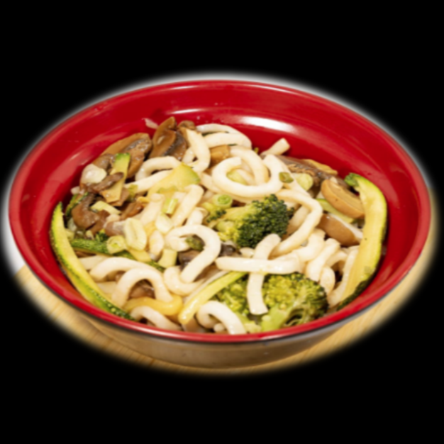 Fondo miso, pasta udon, servido con camarón (3 pz), calabaza, aros de cebolla tempurizados y kakiage de zanahoria. 850 ml.