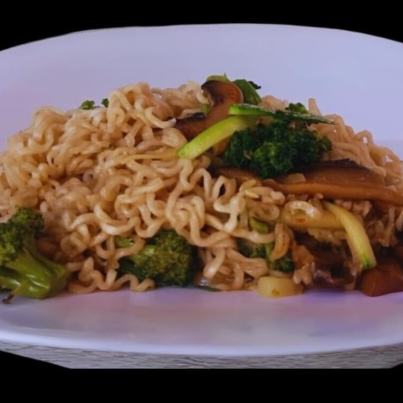 Tallarin ramen salteado en wok con pollo (120 g), con vegetales y salsa agridulce