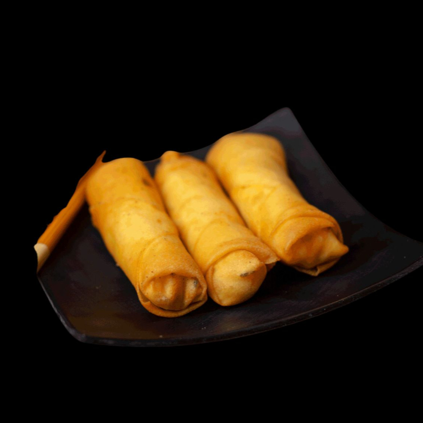 Tres rollitos primavera rellenos de camarón, vegetales y fideos harusame, acompañados con salsa agripicante.