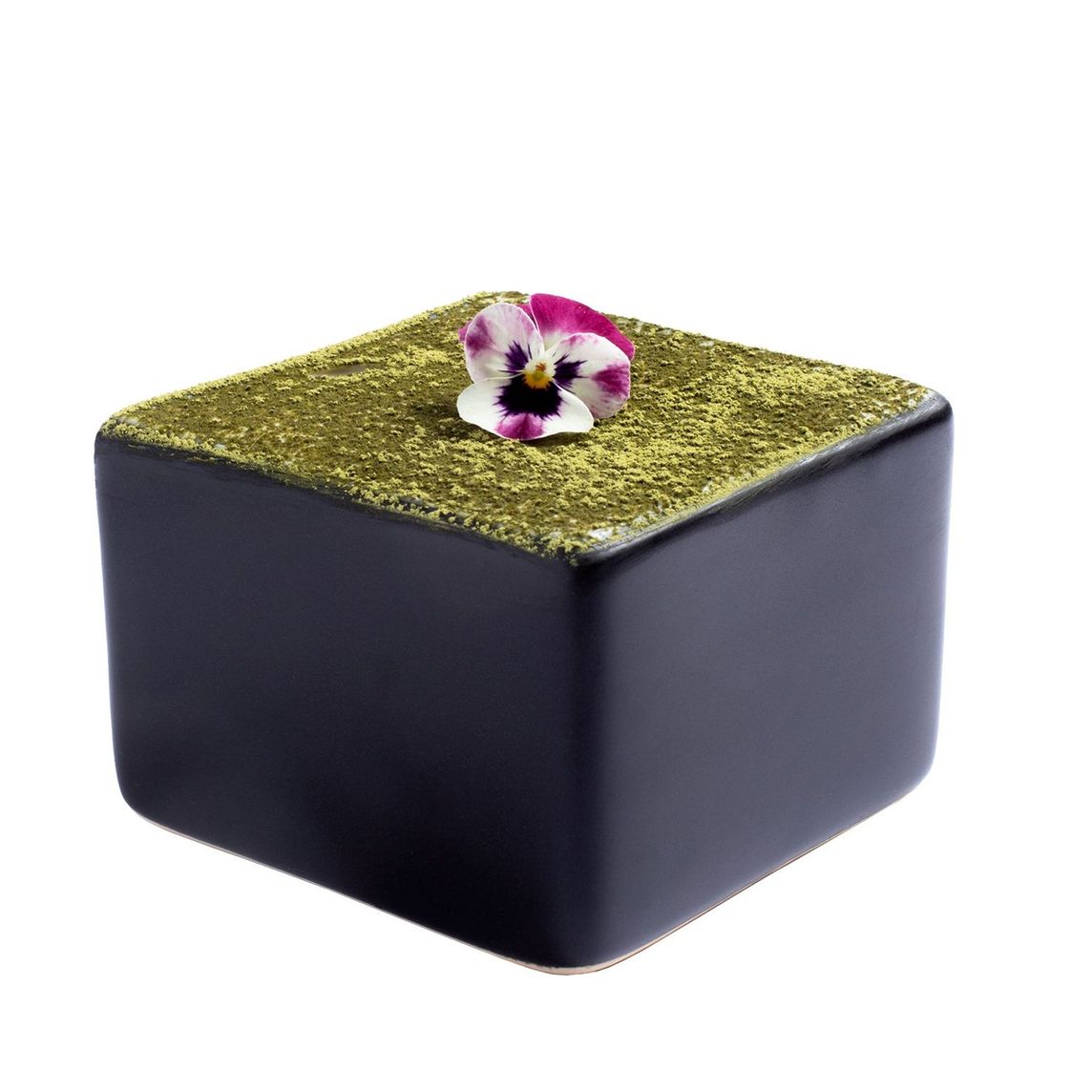 Biscocho esponjoso de matcha acompañado de un suave cremoso de chocolate blanco, queso y tofu, servido con frambuesa y un toque de matcha en polvo