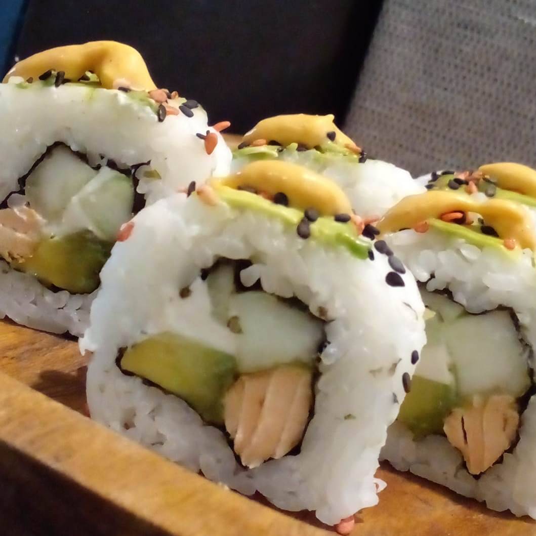 xd: pepino, queso philadelphia, salmon salteado con especias a la plancha, xf: laminas finas de aguacate, ajonjoli y aderezo chipotle