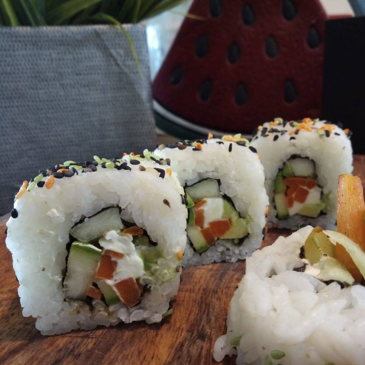 xd: pepino, queso philadelphia, aguacate, calabaza y zanahoria salteadas, xf: ajonjoli