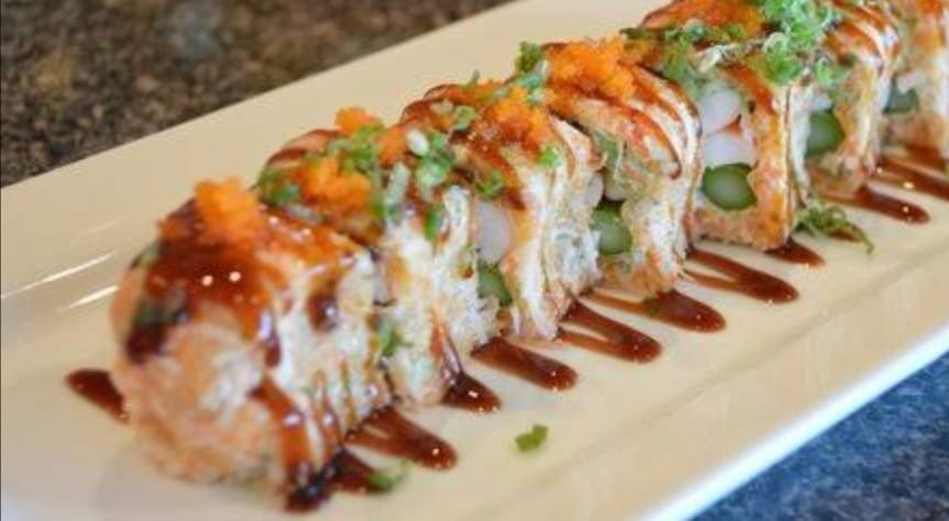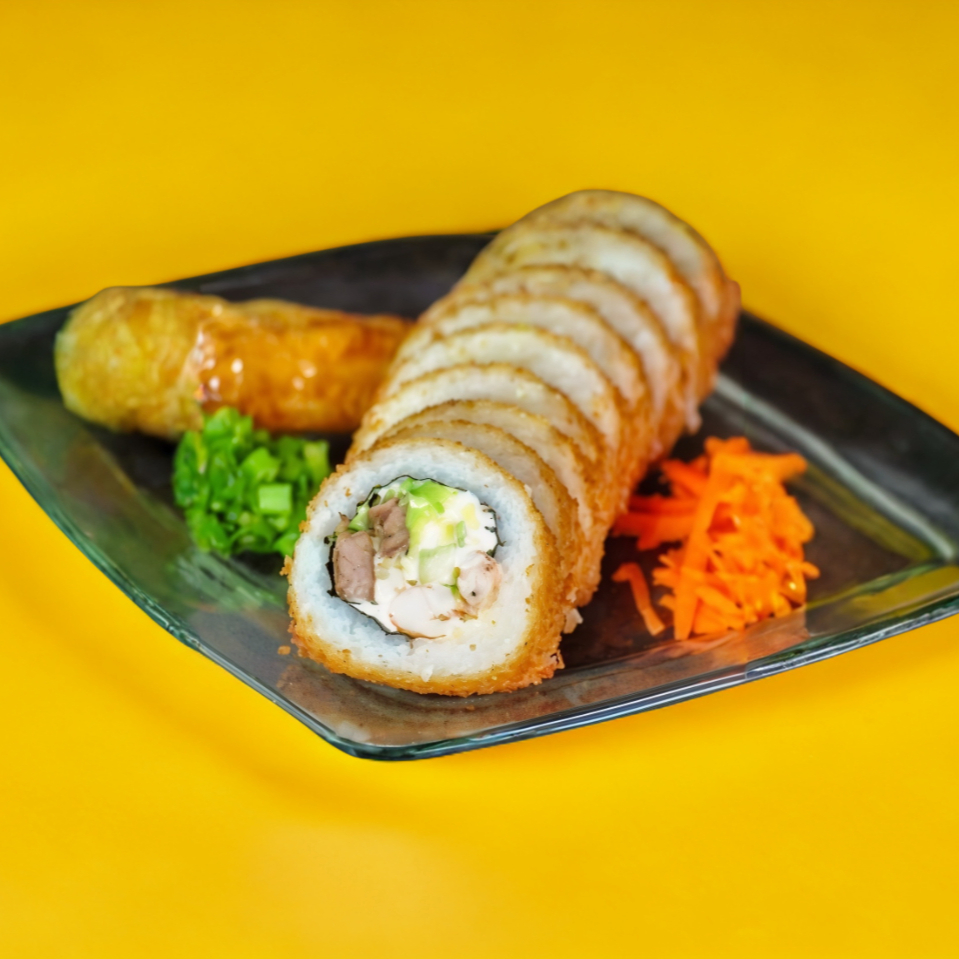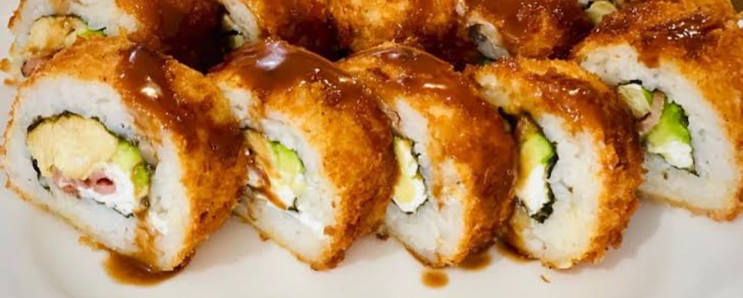 Jaiba suave, aguacate, salsa spicy, shichimi, ajonjolí, lechuga orejona y queso por dentro bañado con salsa de anguila.