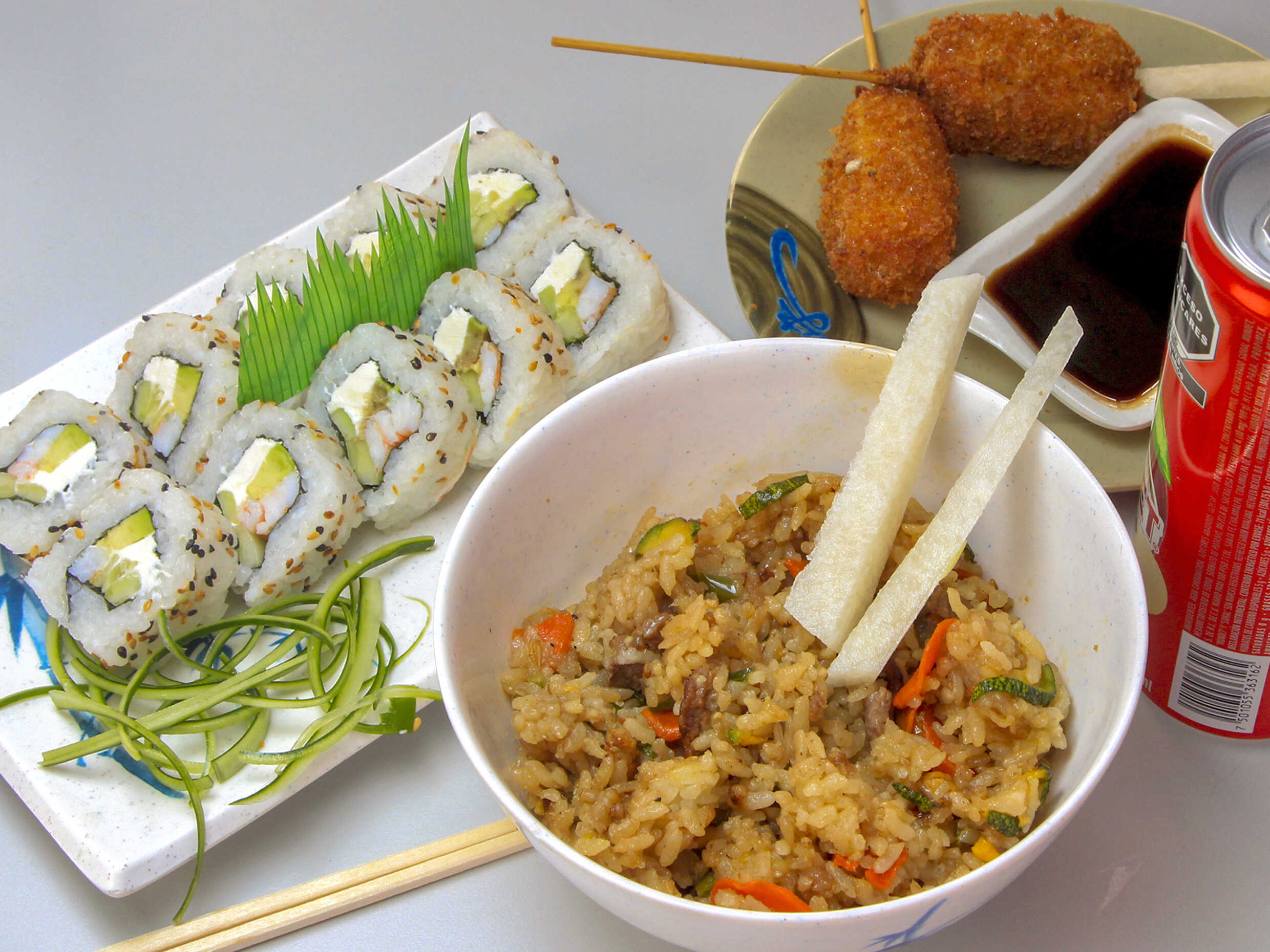 Kushiague de Queso*2 + Sushi Tradicional California*1 + Arroz Yakimeshi*1 + Coca-Cola*1