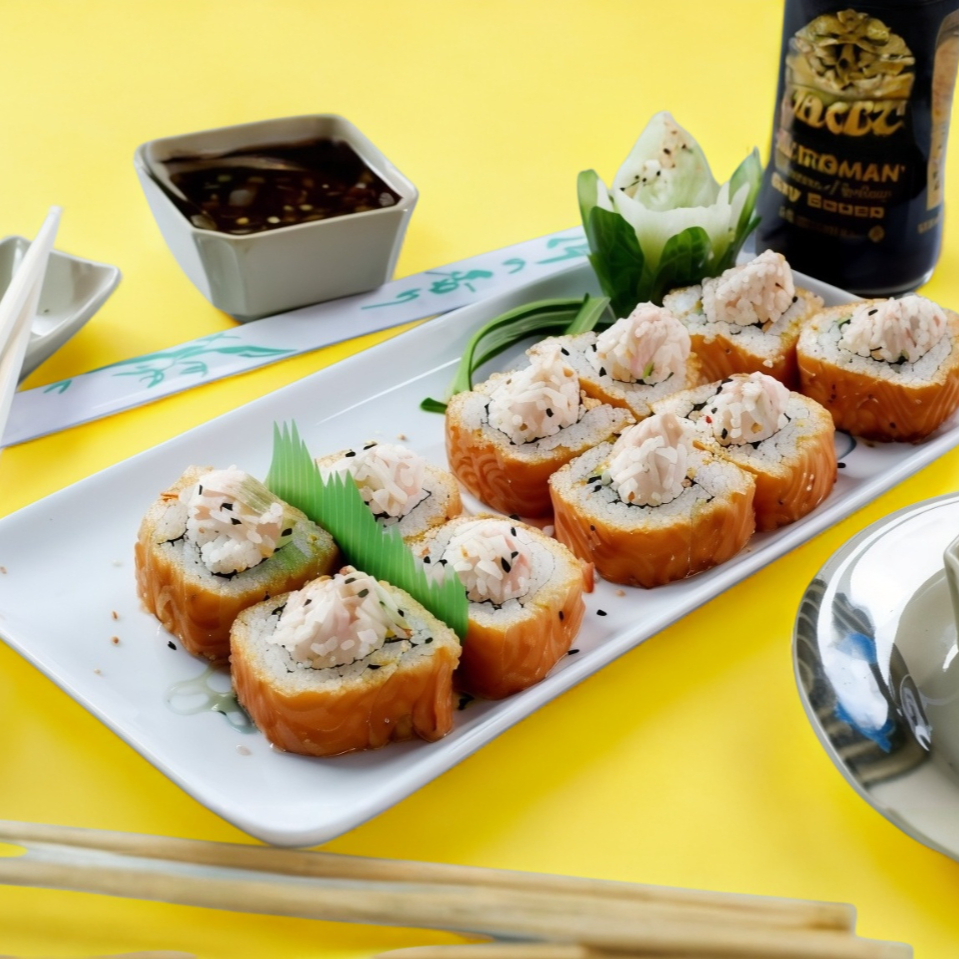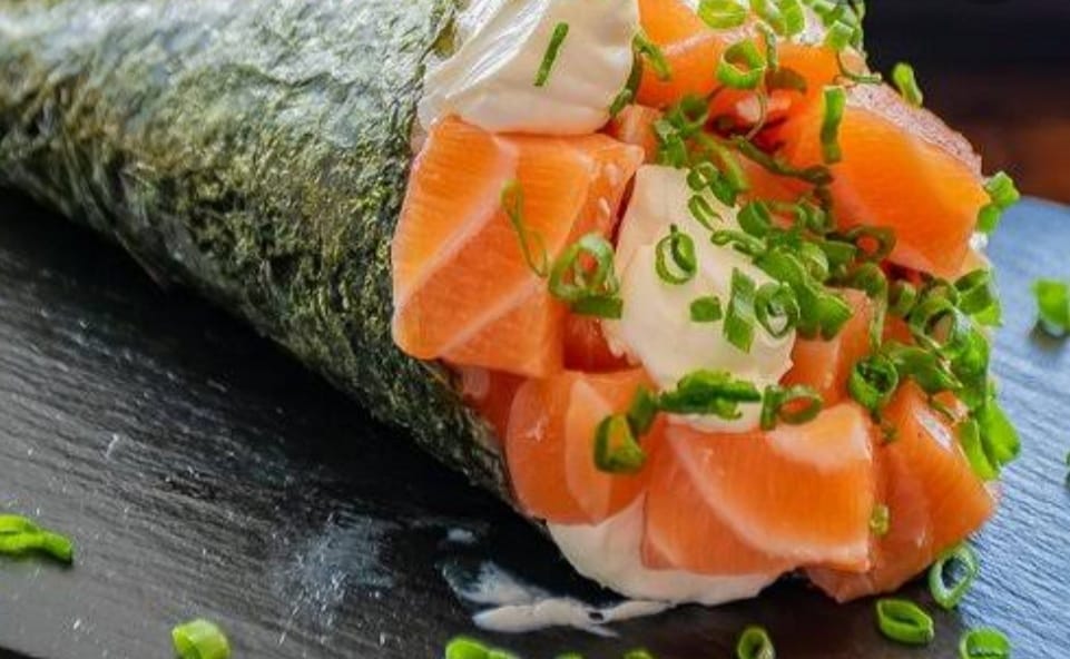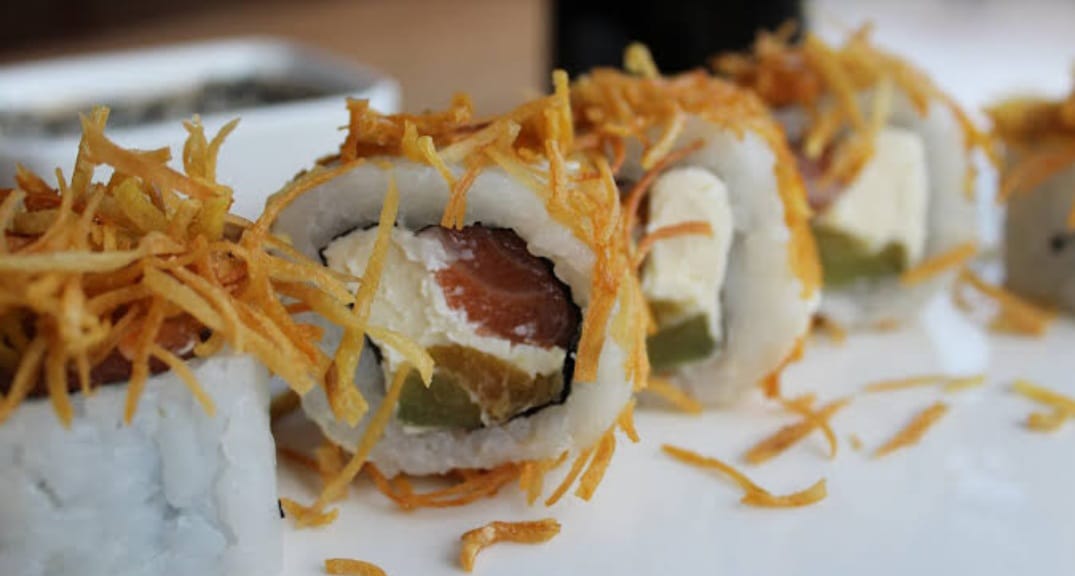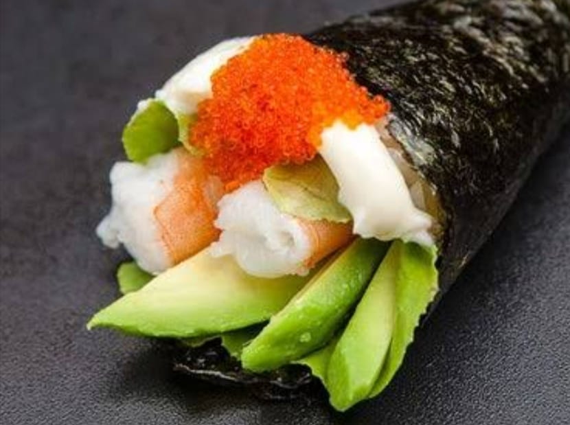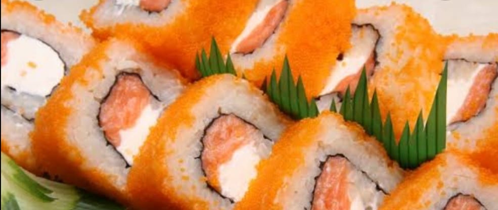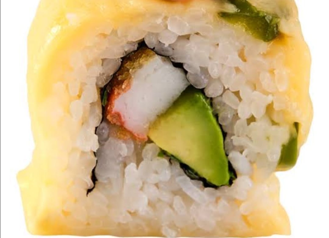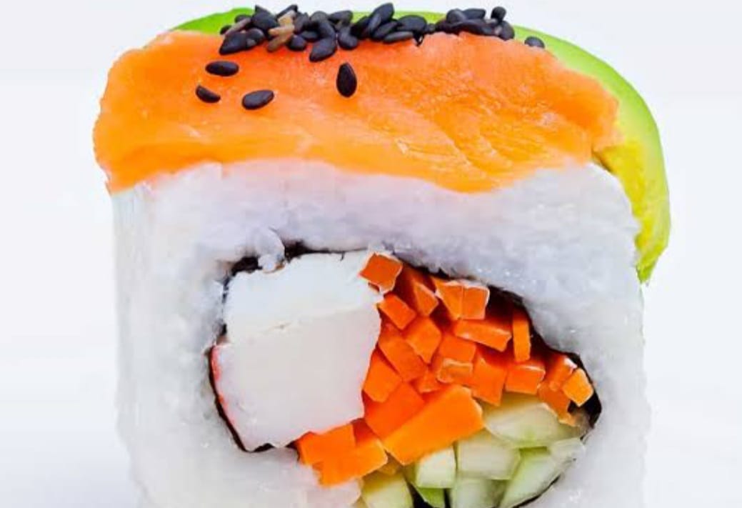 Rollo de arroz relleno de queso aguacate camarón y salmón.