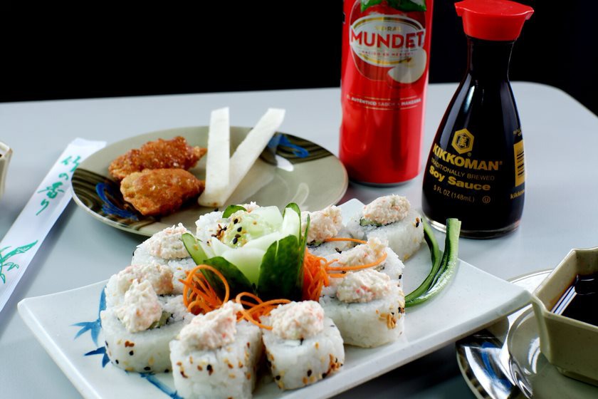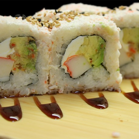 Aguacate, pepino, camarón, queso, masago por fuera, cangrejo y tampico por dentro.