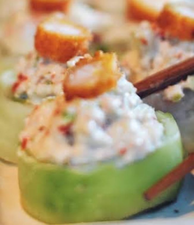 Camarón, queso, aguacate y pepino.