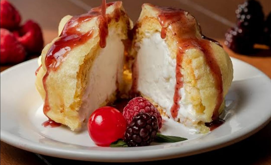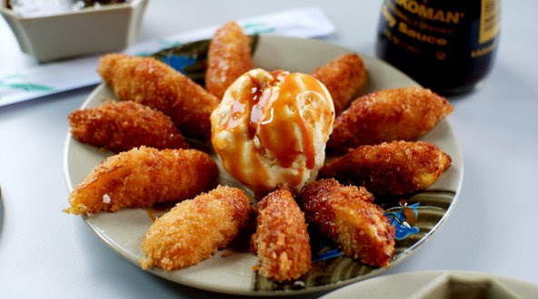 Plátano empanizado con helado, bañado en salsa de chocolate, fresa o cajeta. Su elaboración requiere de 30 minutos.