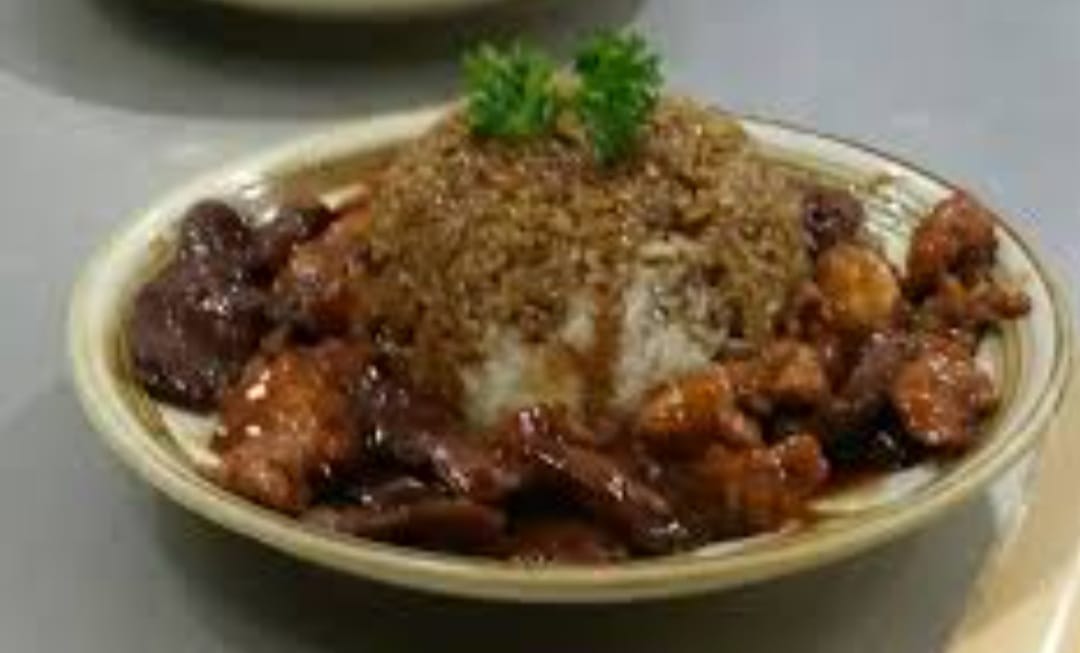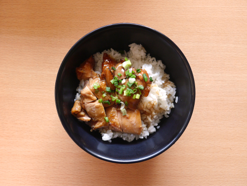 Carne sazonada con salsa teriyaki sobre una cama de yakimeshi o gohan.