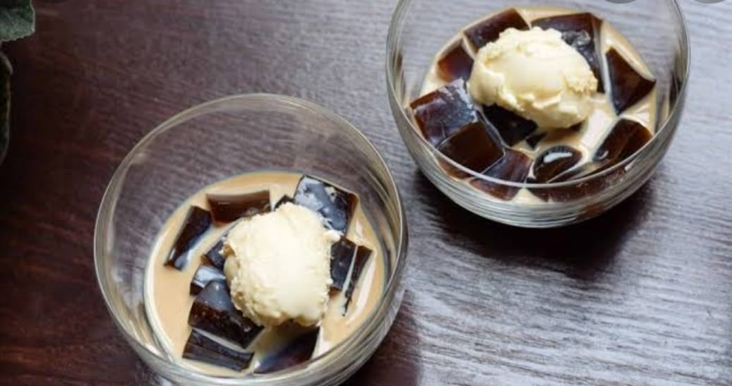 Gelatina de café, salsa de kahlua y helado de vainilla. Su elaboración requiere de 30 minutos.
