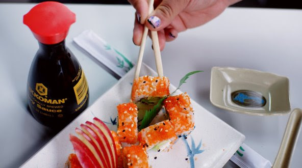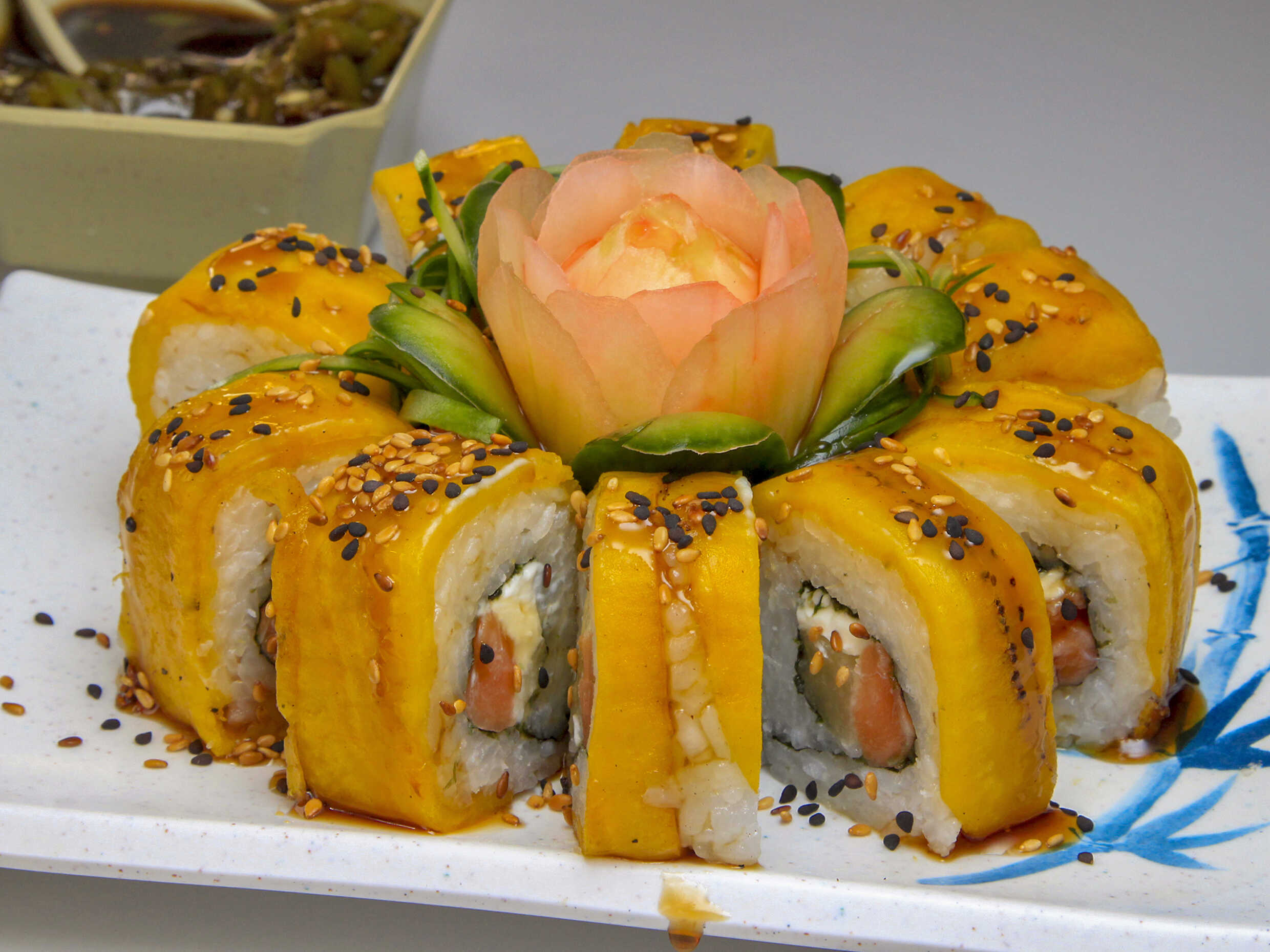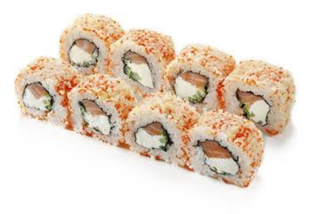 Queso, salmón, aguacate, cangrejo por dentro, suma de pepino por fuera, masago y salsa de tampico arriba.