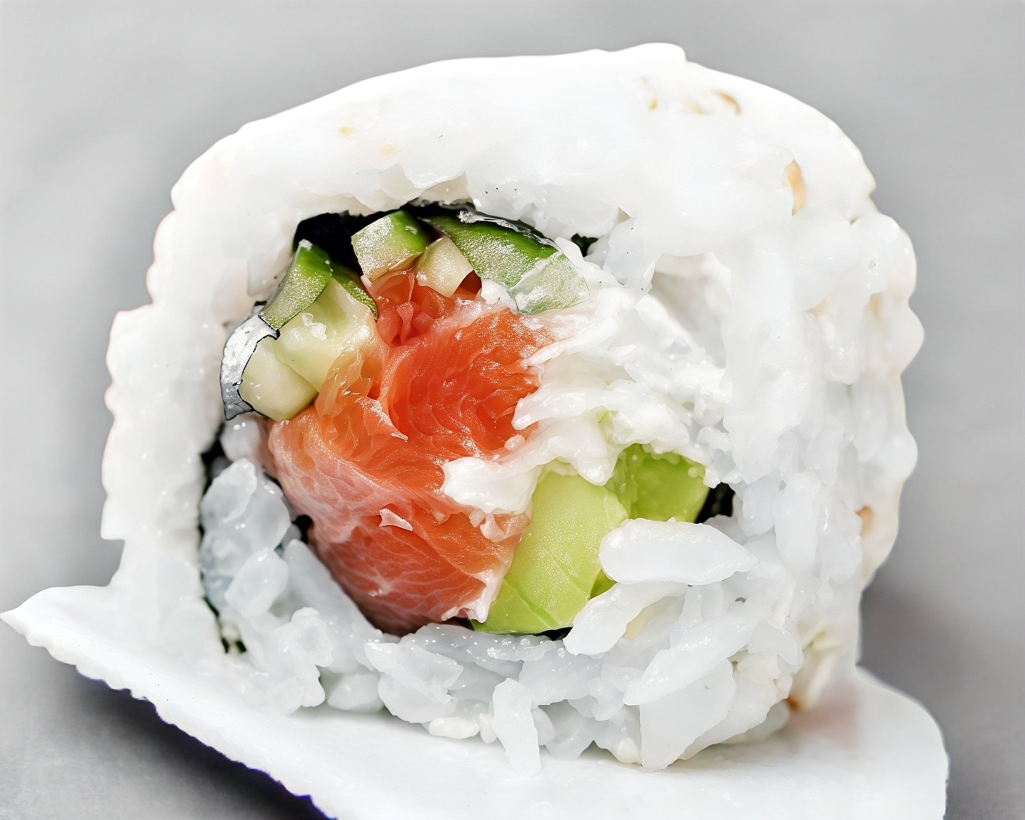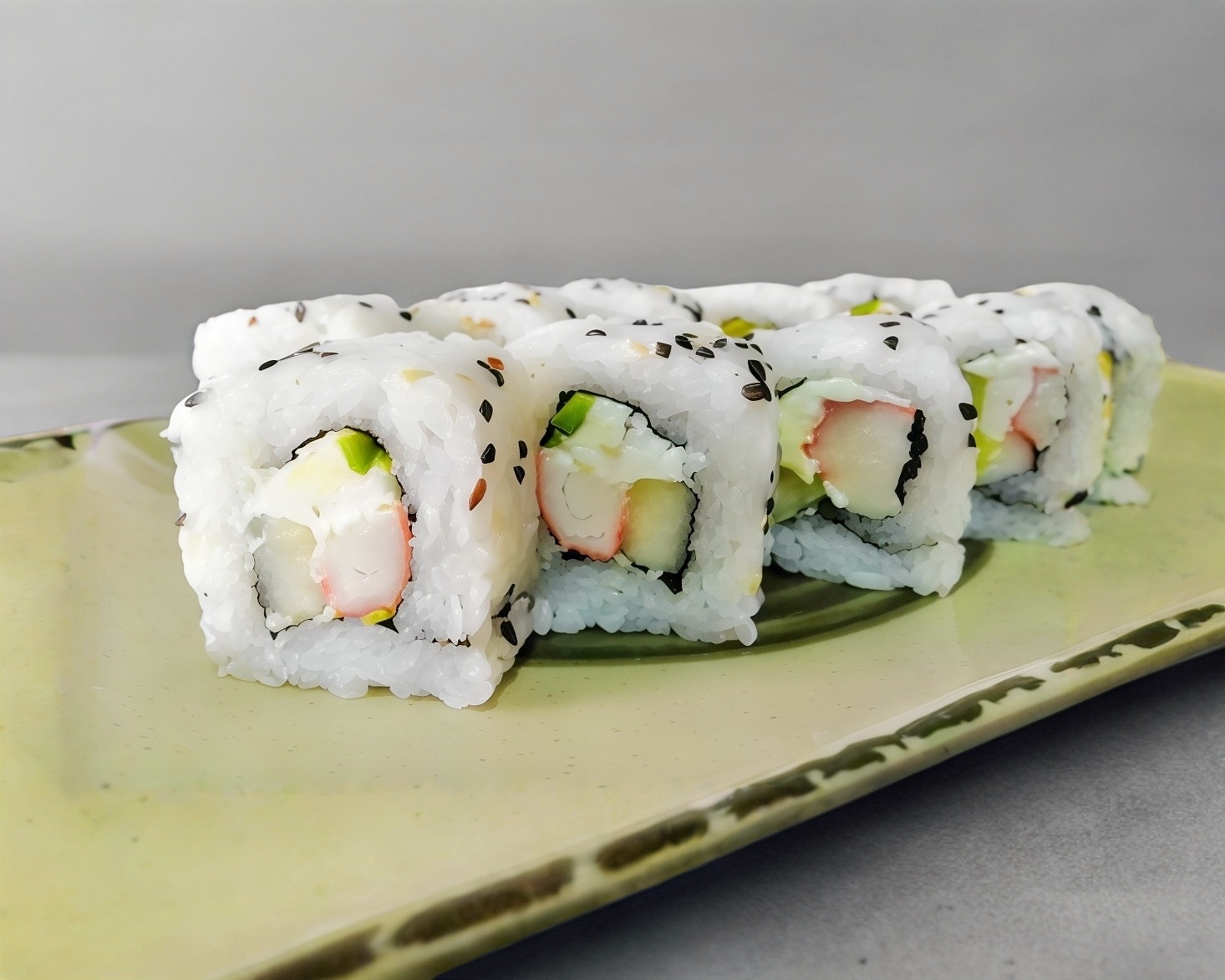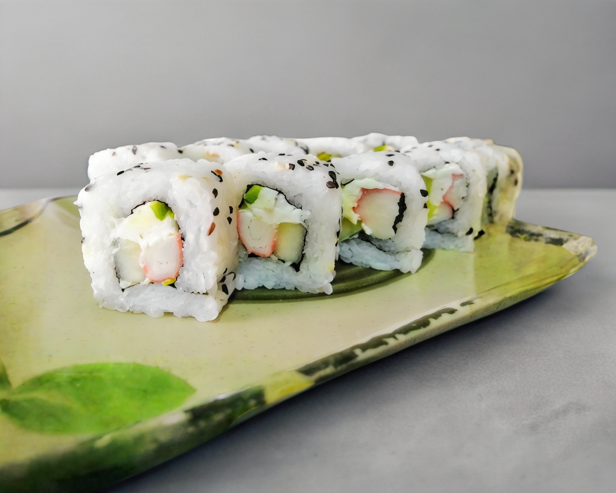 Por fuera: surimi. Por dentro: queso crema, aguacate y pepino.