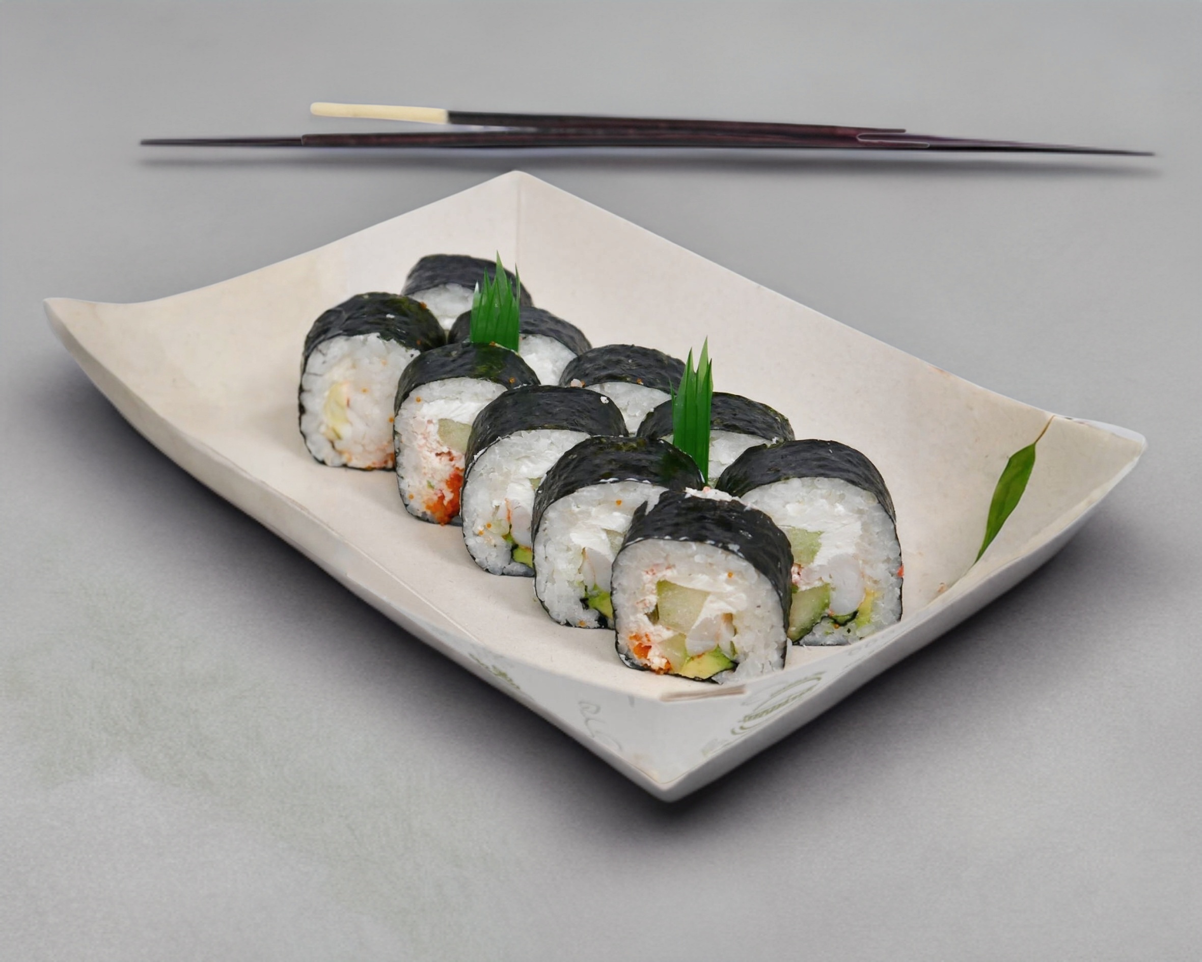 Por fuera: alga marina. Por dentro: masago, tampico, queso crema, aguacate, pepino y camarón.