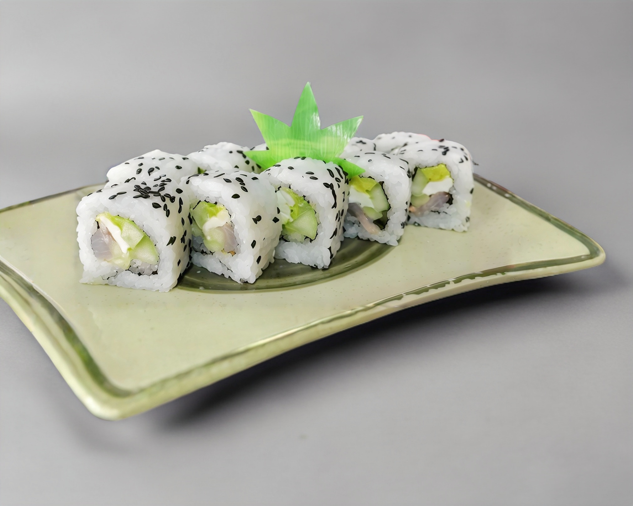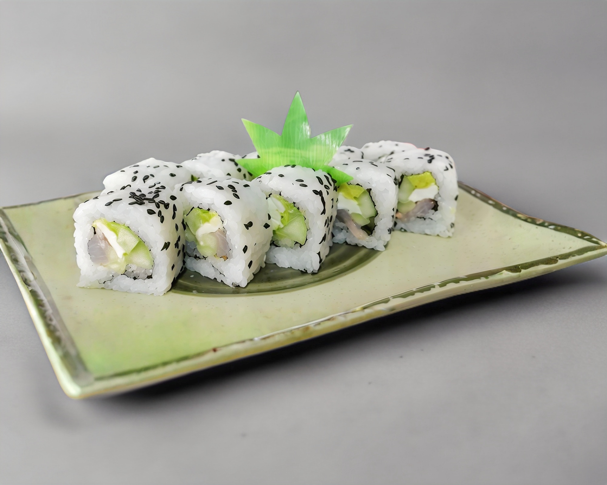 Por fuera verdura capeada, por dentro tampico, aguacate, queso crema y pepino.