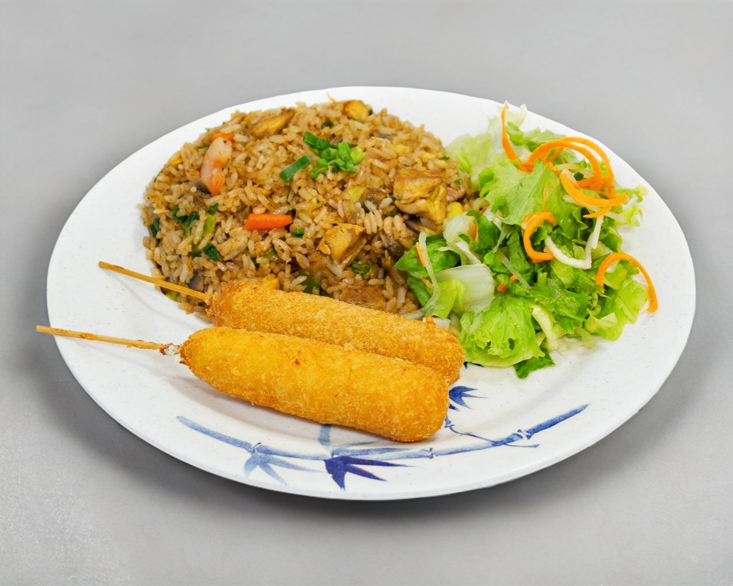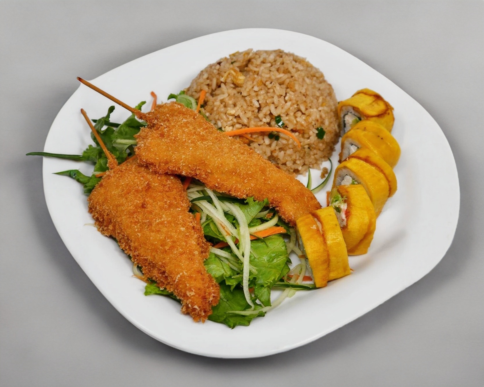 1 Arroz Frito, +5 rollitos de platano, +2 pzas de brocheta de pollo