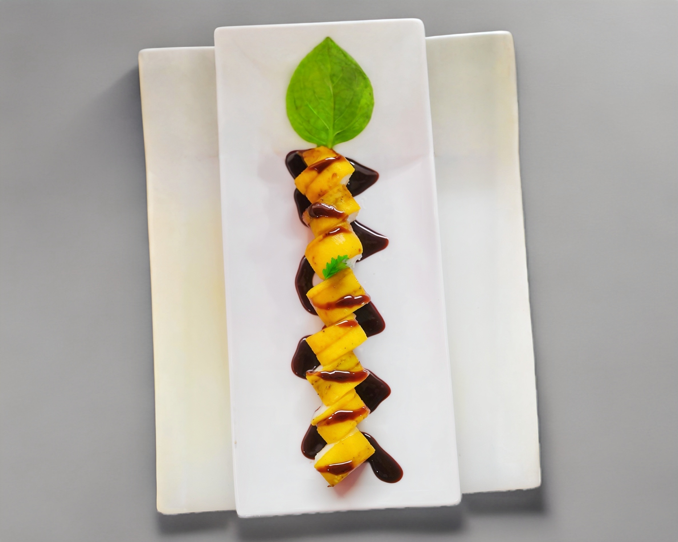 Por fuera: plátano macho frito. Por dentro: tampico, queso crema, aguacate y pepino.