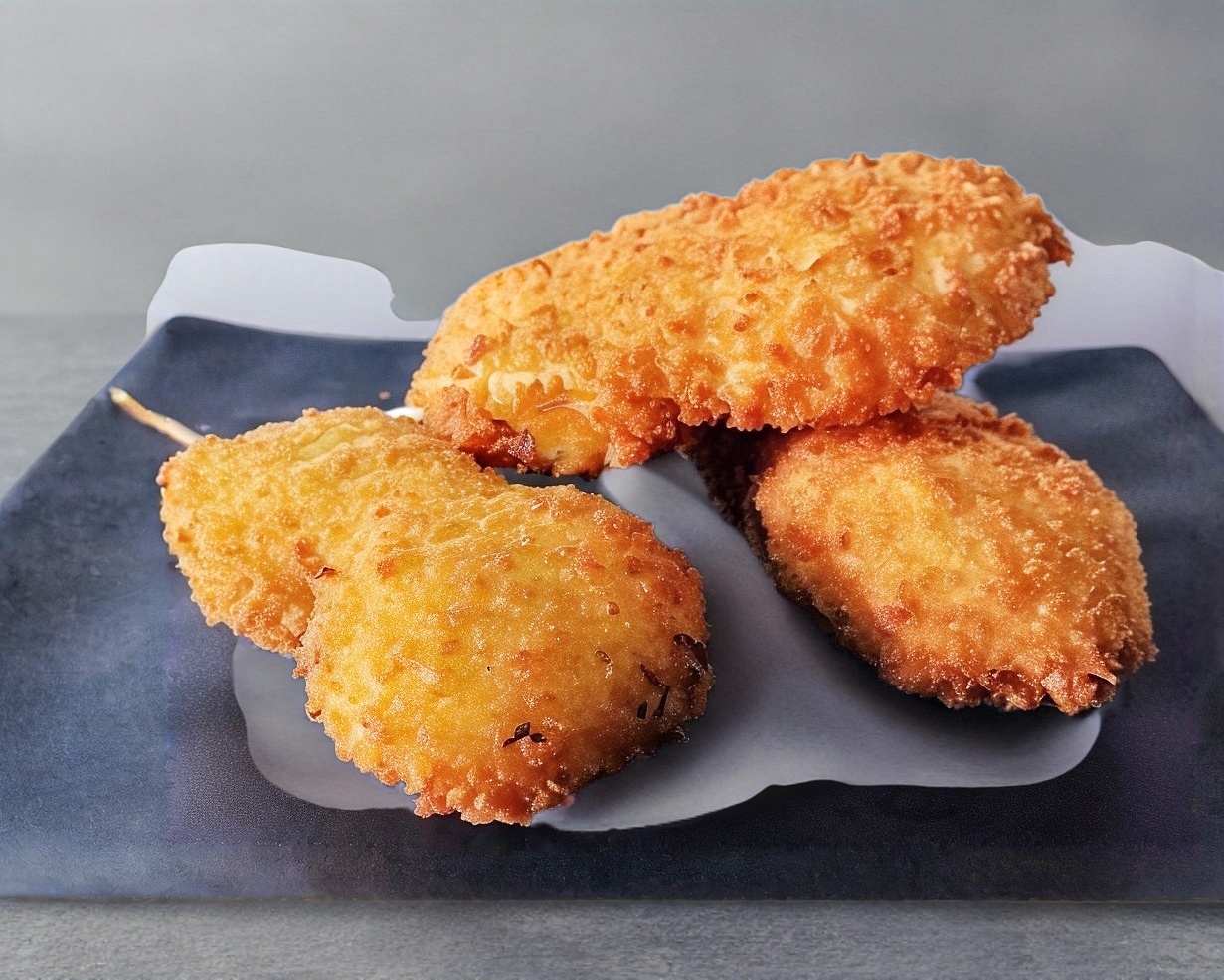 Brocheta empanizada de pollo.