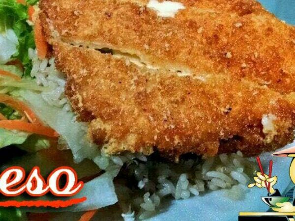 Milanesa de pollo rellena de queso Philadelphia o manchego, acompañada de arroz frito y ensalada.