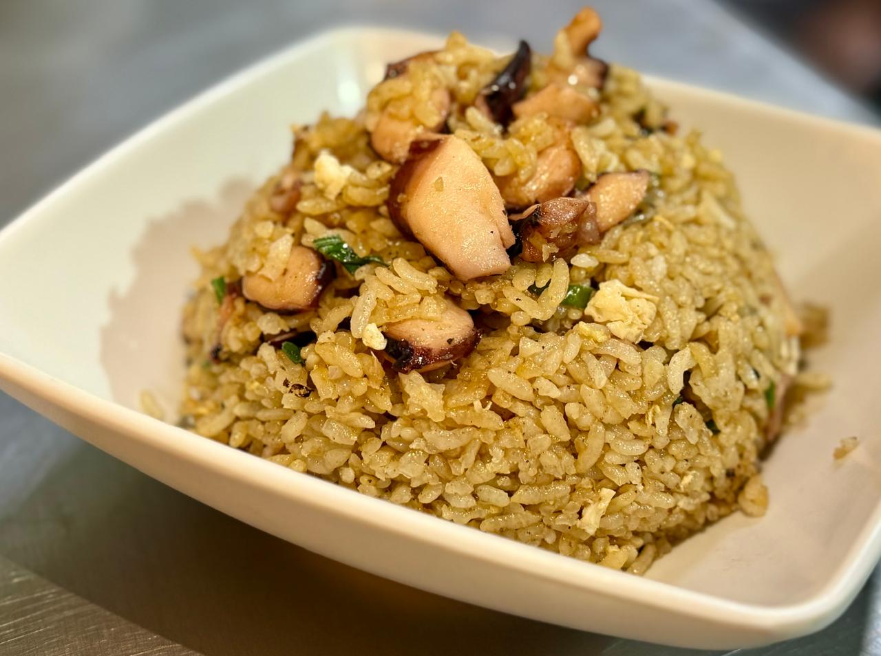 Arroz frito con pulpo y ajo.