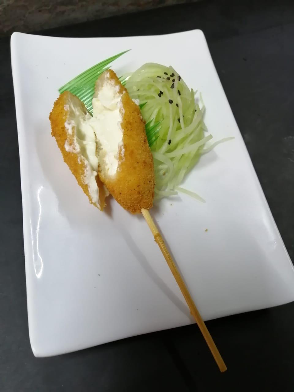 Por fuera queso crema, por dentro camarón empanizado, aguacate y pepino.