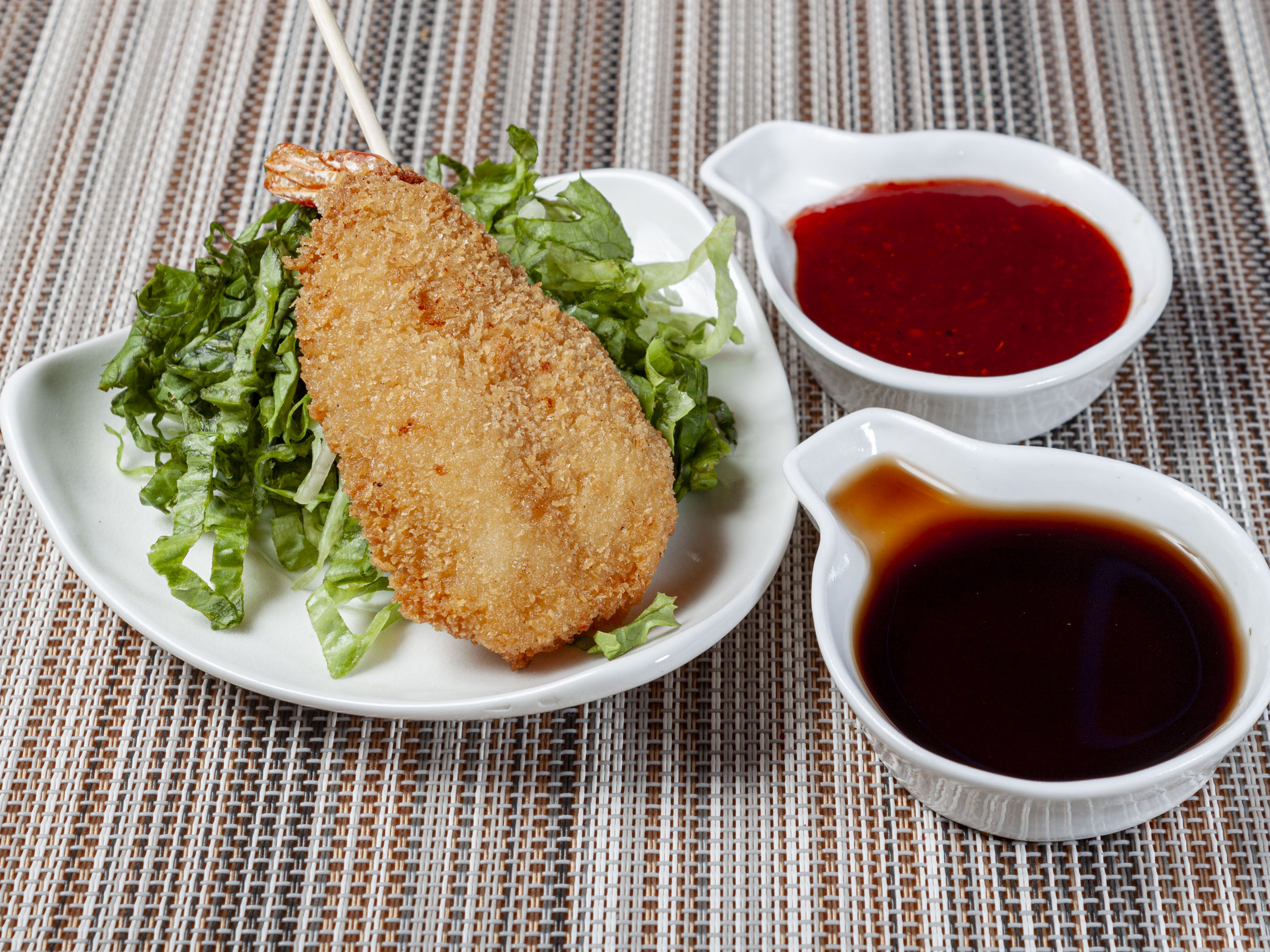 Camarones con queso philadelphia empanizados acompañado con ensalada de lechuga italiana, zanahoria, pepino y arroz frito.