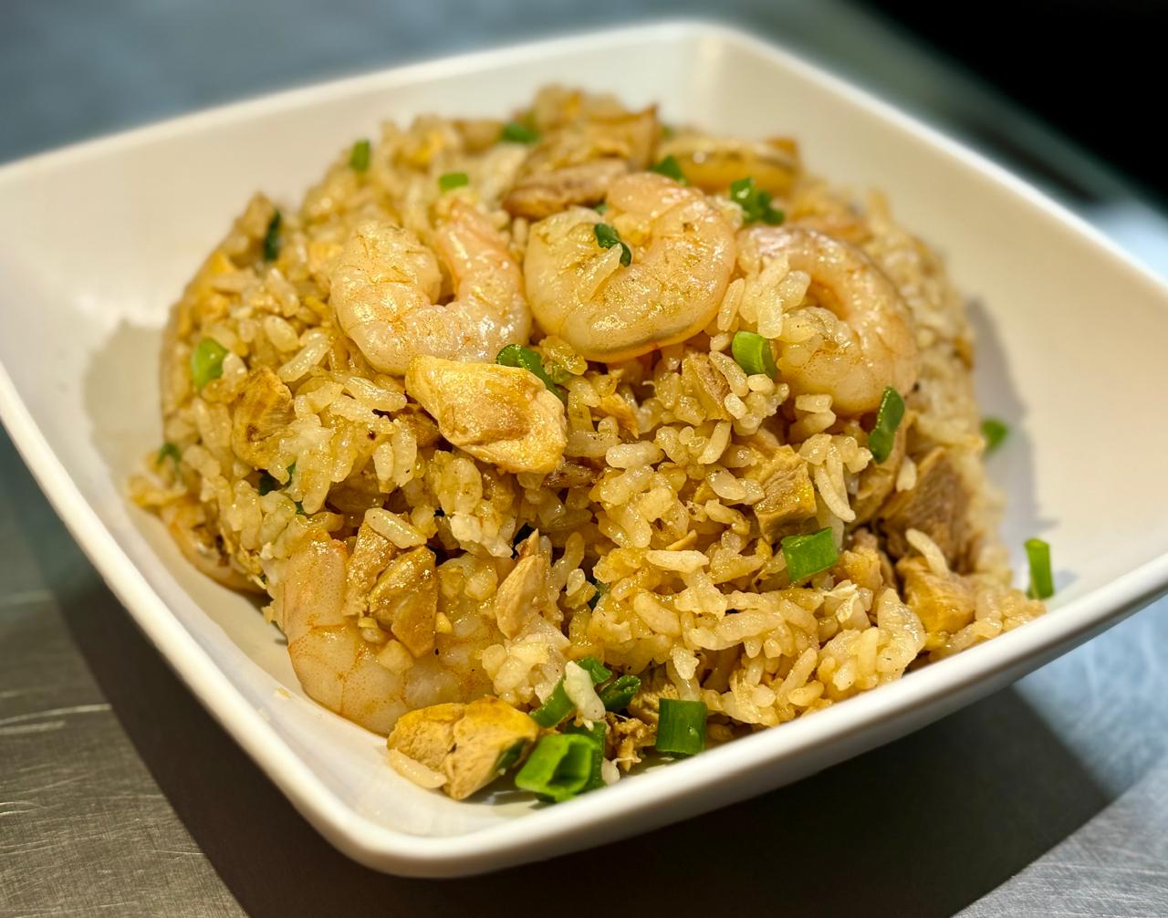 Camarones salteados con una salsa agridulce, ligeramente picante y arroz al vapor.