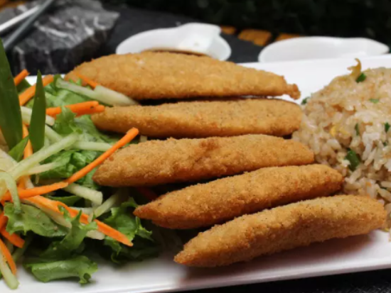 Pescado empanizado, acompañado con ensalada de lechuga italiana, zanahoria, pepino y arroz frito. PUEDE VENIR COMO EN LA IMAGEN O EN FILETE COMO EL TORIKATSU