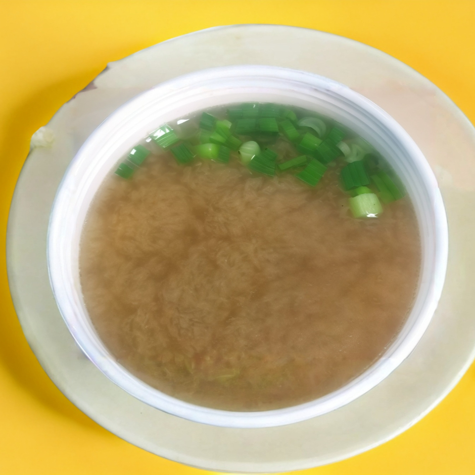 Sopa de pasta de soya con tofu y alga marina.