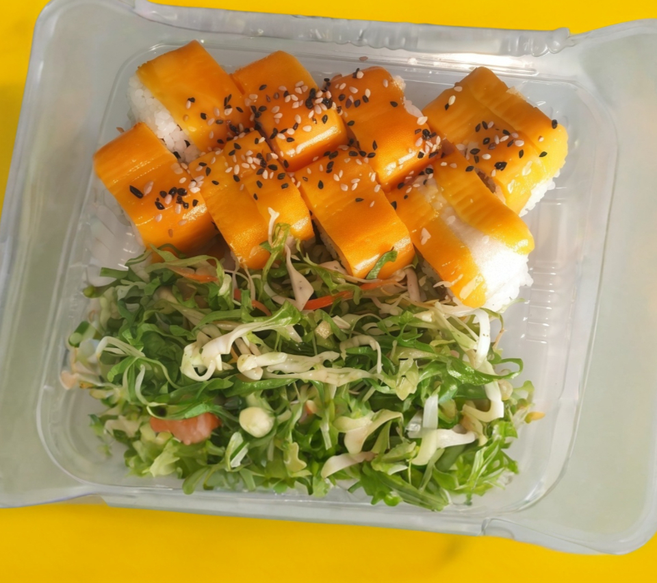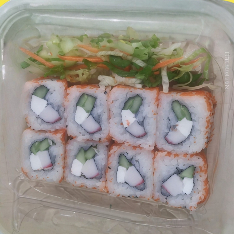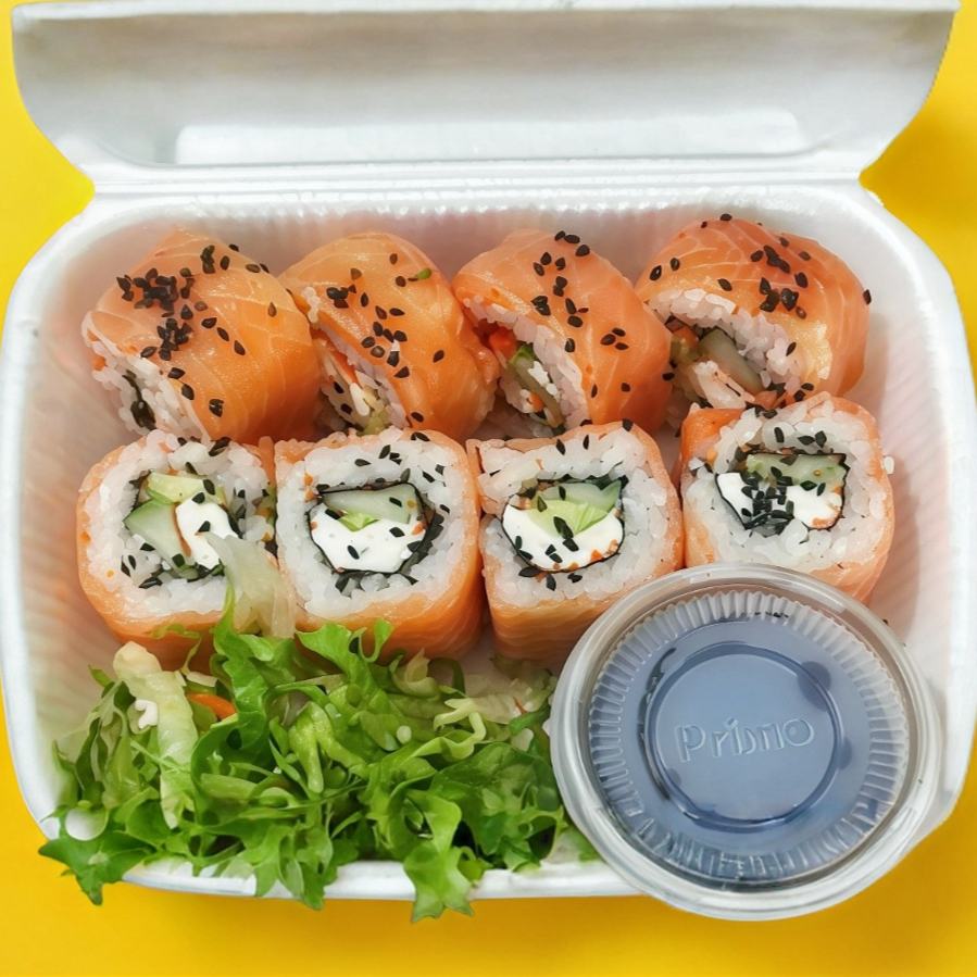 Salmón, masago, queso philadelphia, pepino y aguacate.