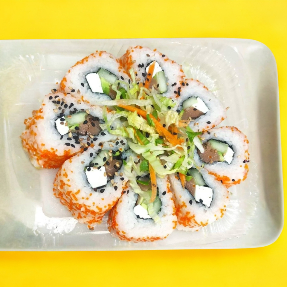Masago, camarón, queso philadelphia, pepino y aguacate.