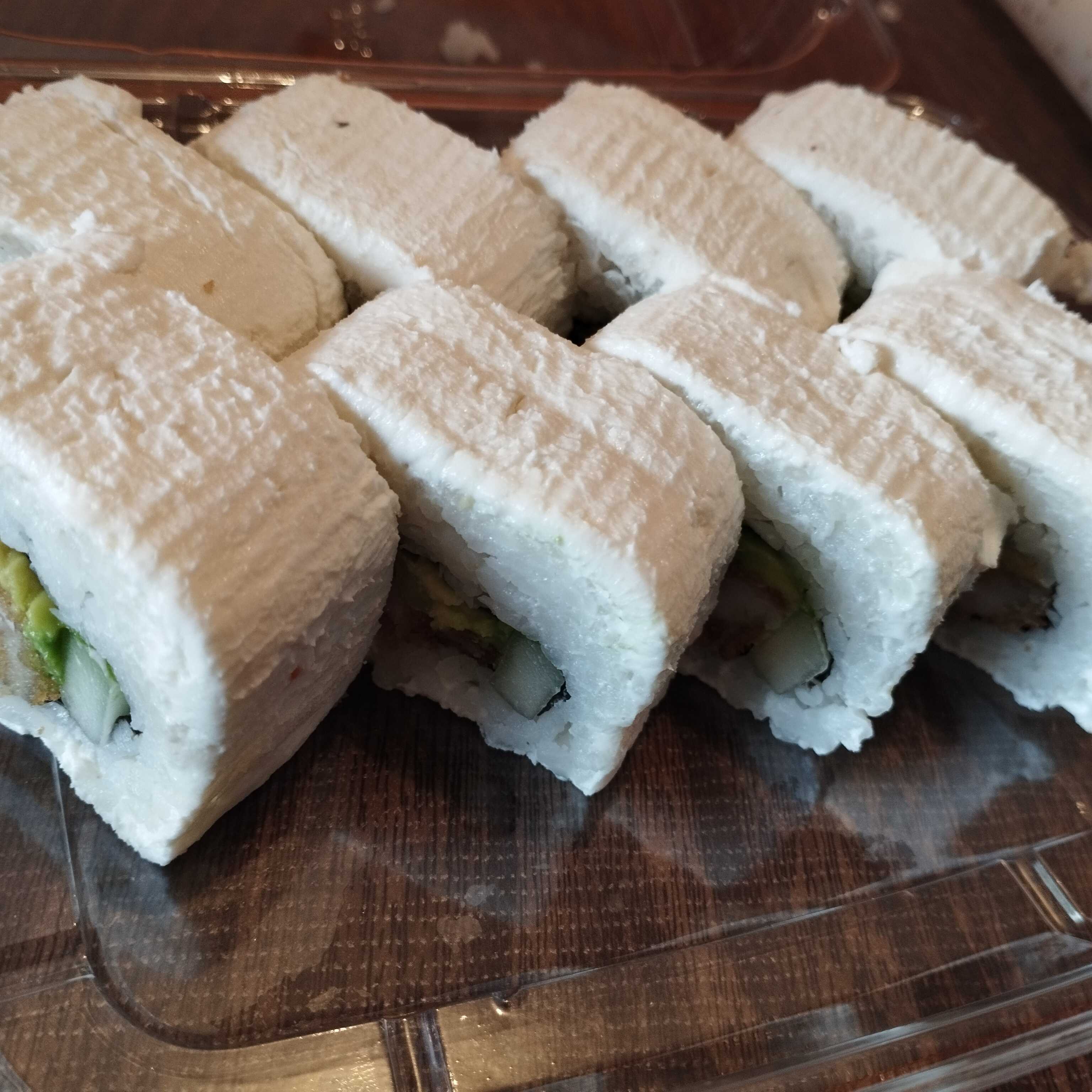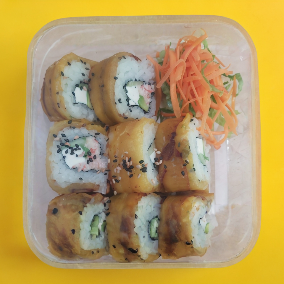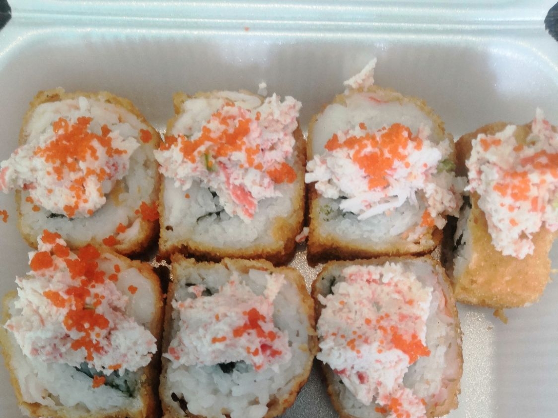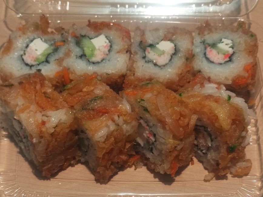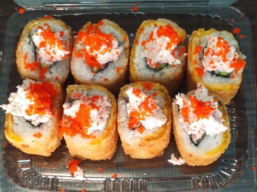 Pescado capeado, tampico, masago, pepino, aguacate y surimi.
