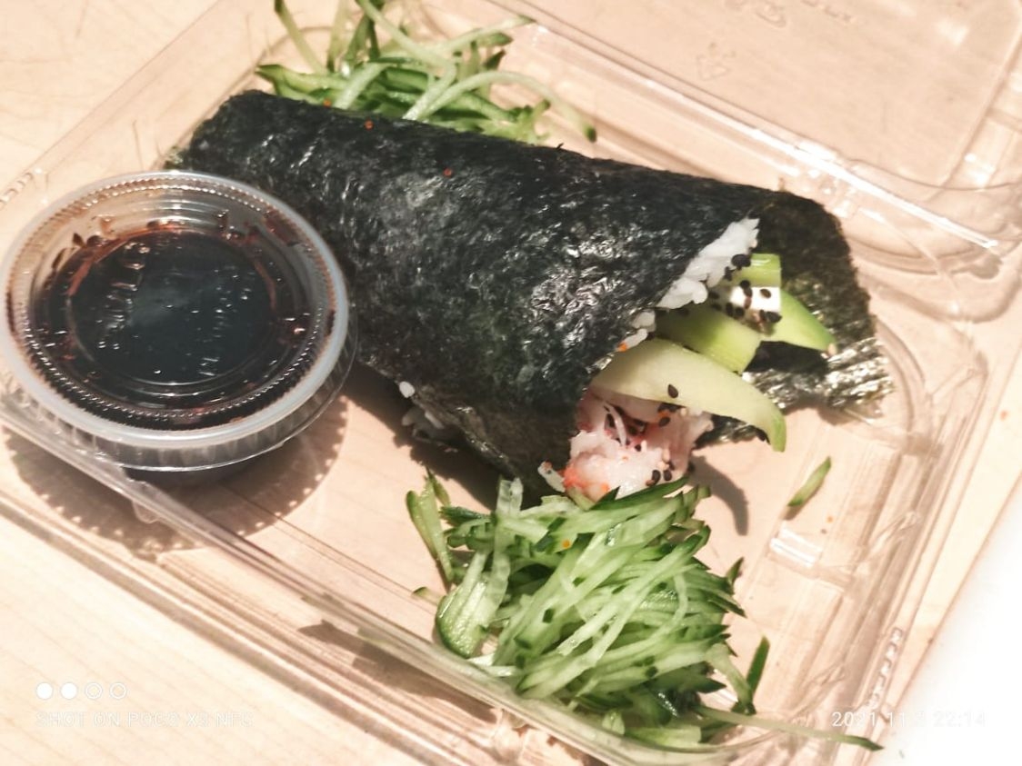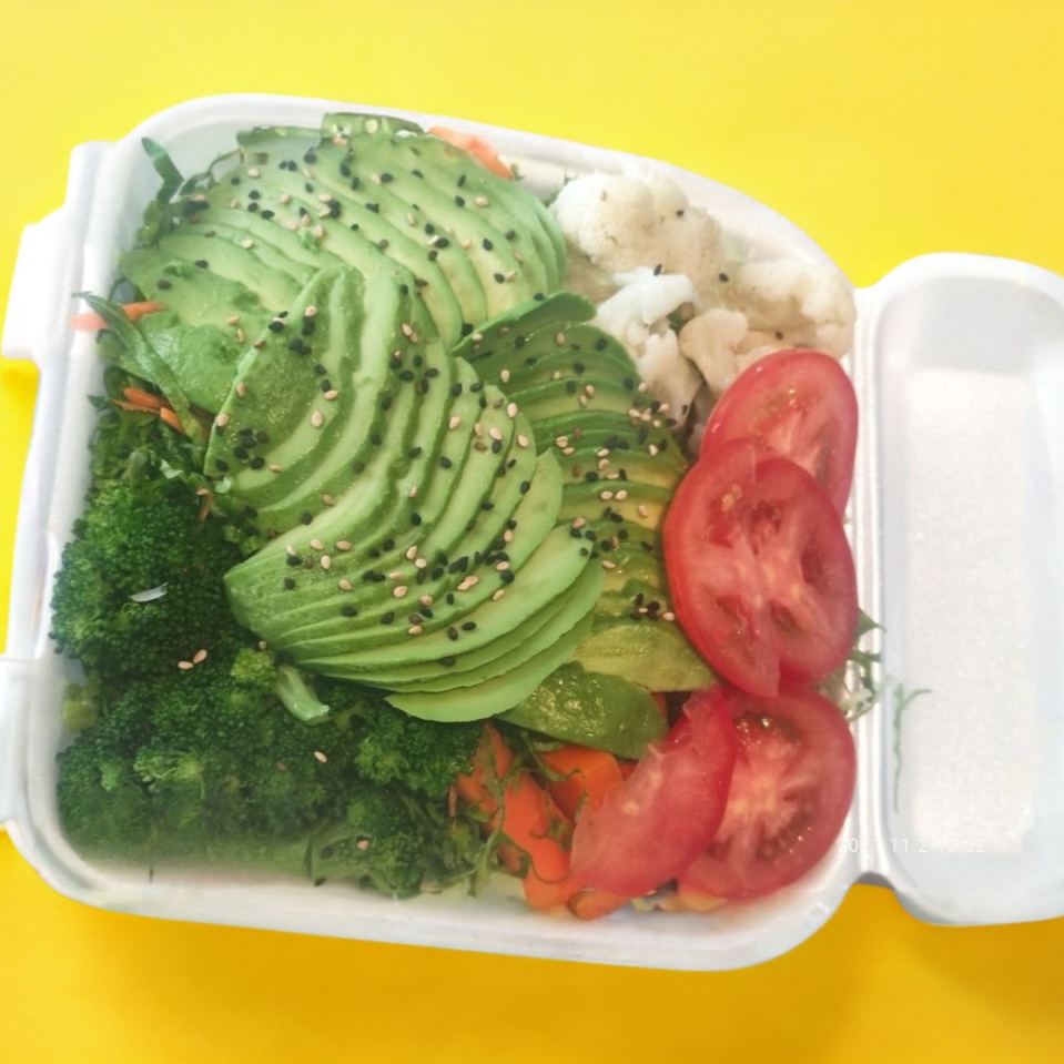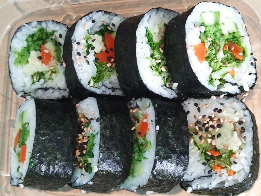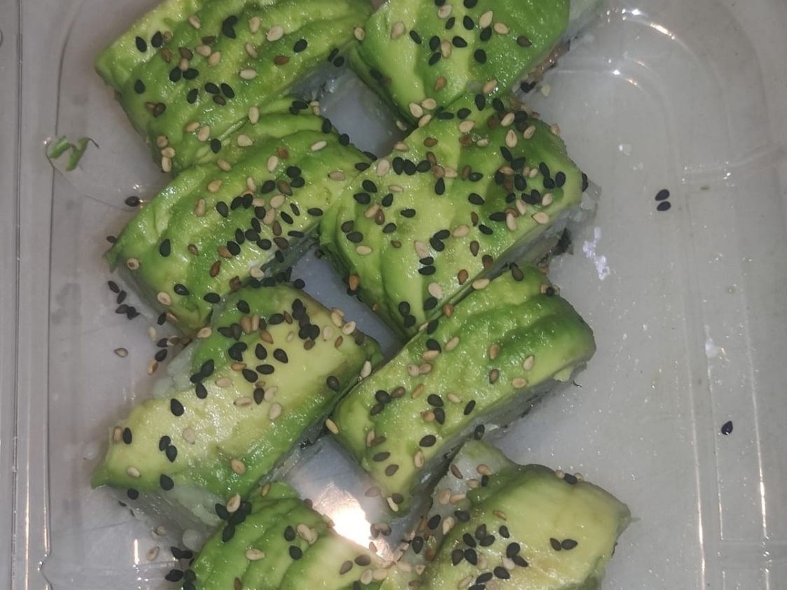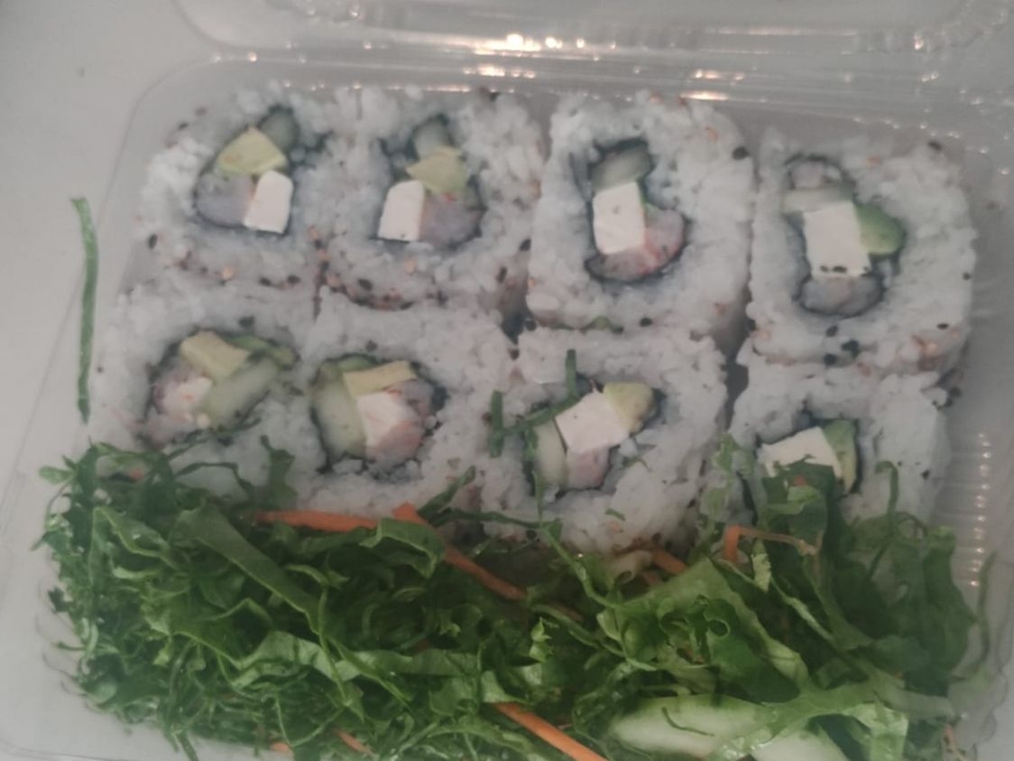 Alga, ensalada de lechuga, pepino, aguacate, zanahoria, brocoli, coliflor y queso philadelphia.