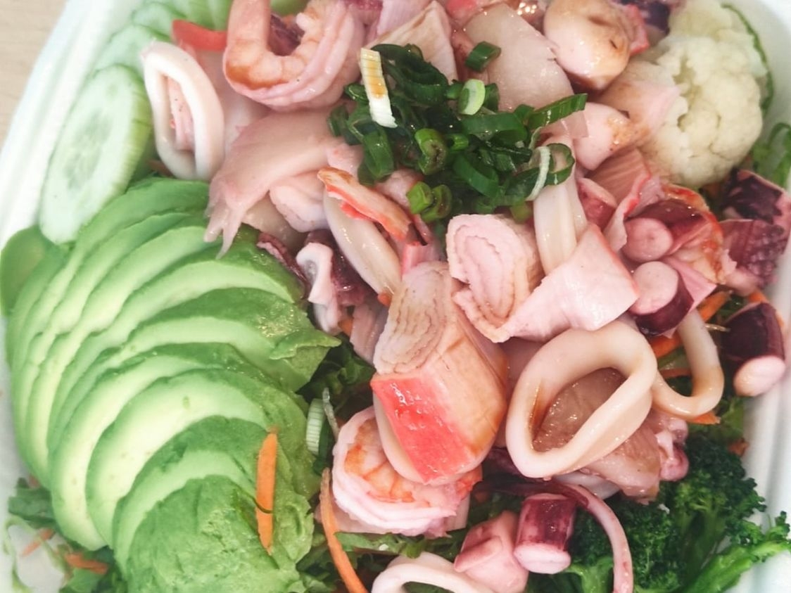 Pulpo, calamar, surimi, pescado, camarón y verduras.