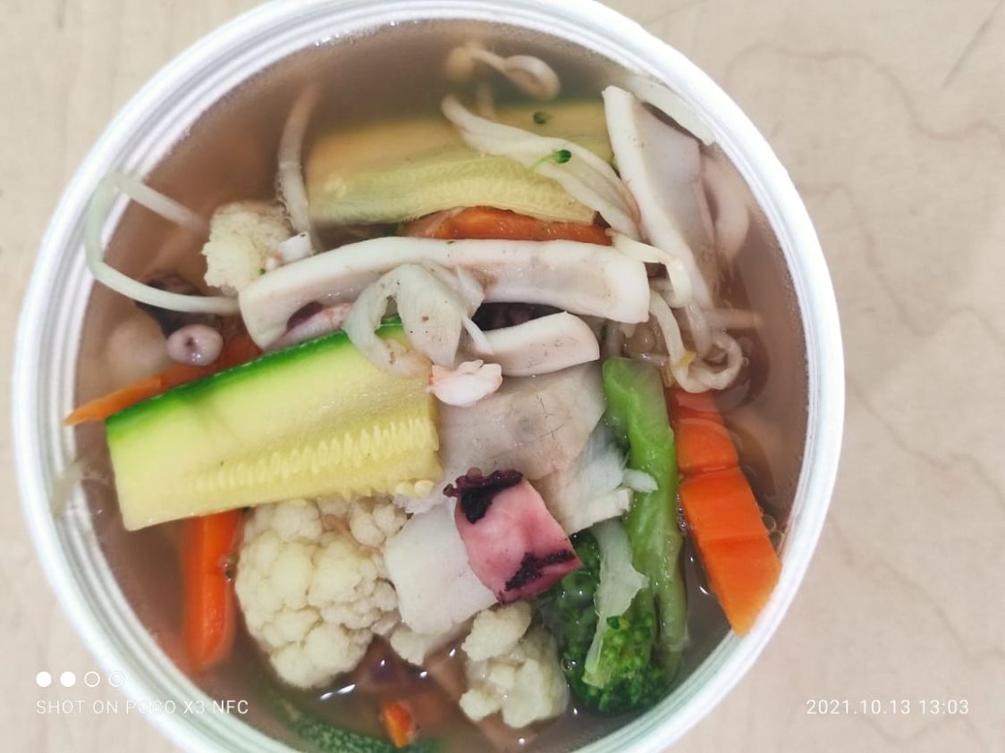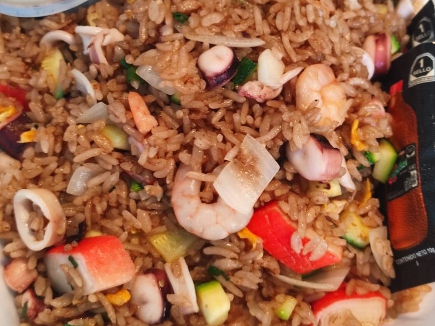 Contiene marisco, carne y verduras.