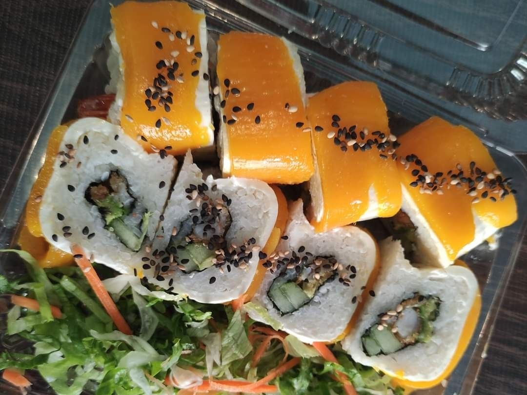 Mango, queso philadelphia, camarón empanizado, pepino y aguacate.