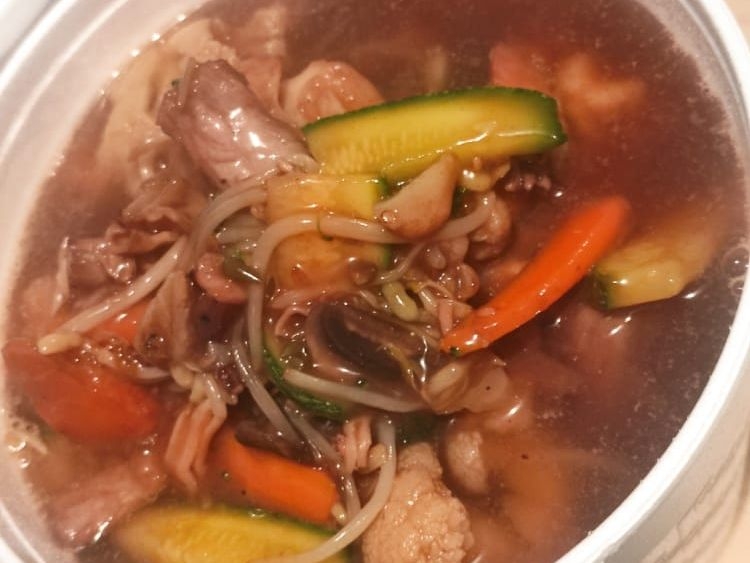 Contiene pollo y verduras.