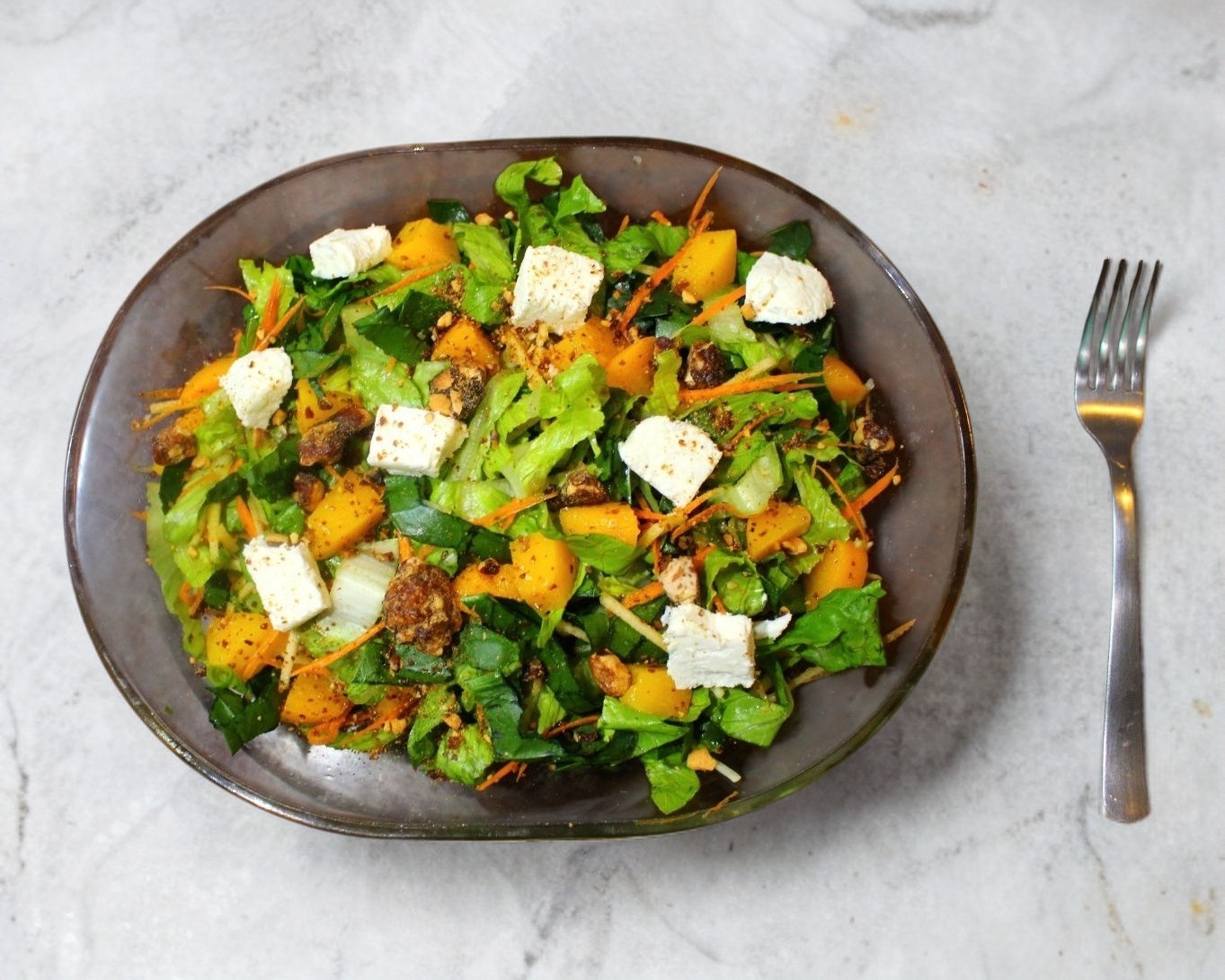 Durazno, queso doble crema, almendra caramelizada, base de espinaca con lechuga, manzana y zanahoria rallada.