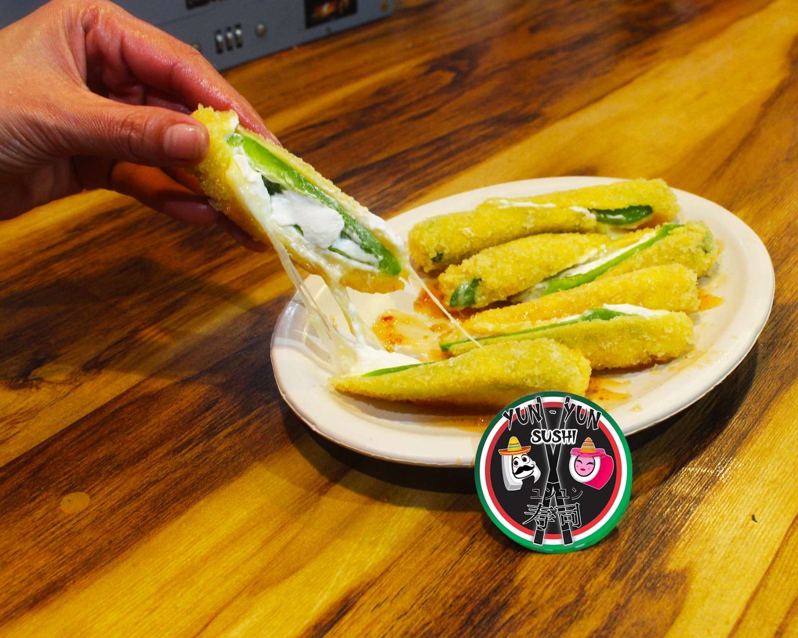 Chiles jalapeños empanizados y rellenos de queso manchego y Philadelphia.